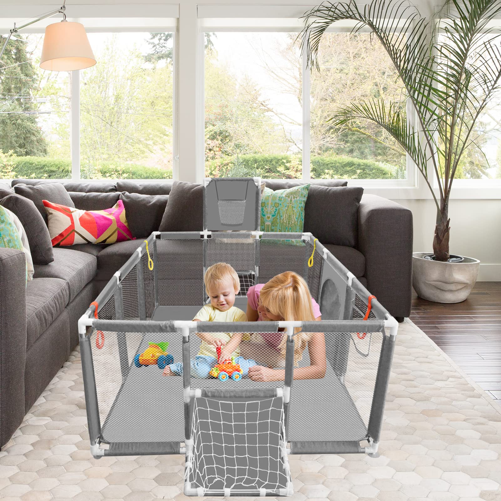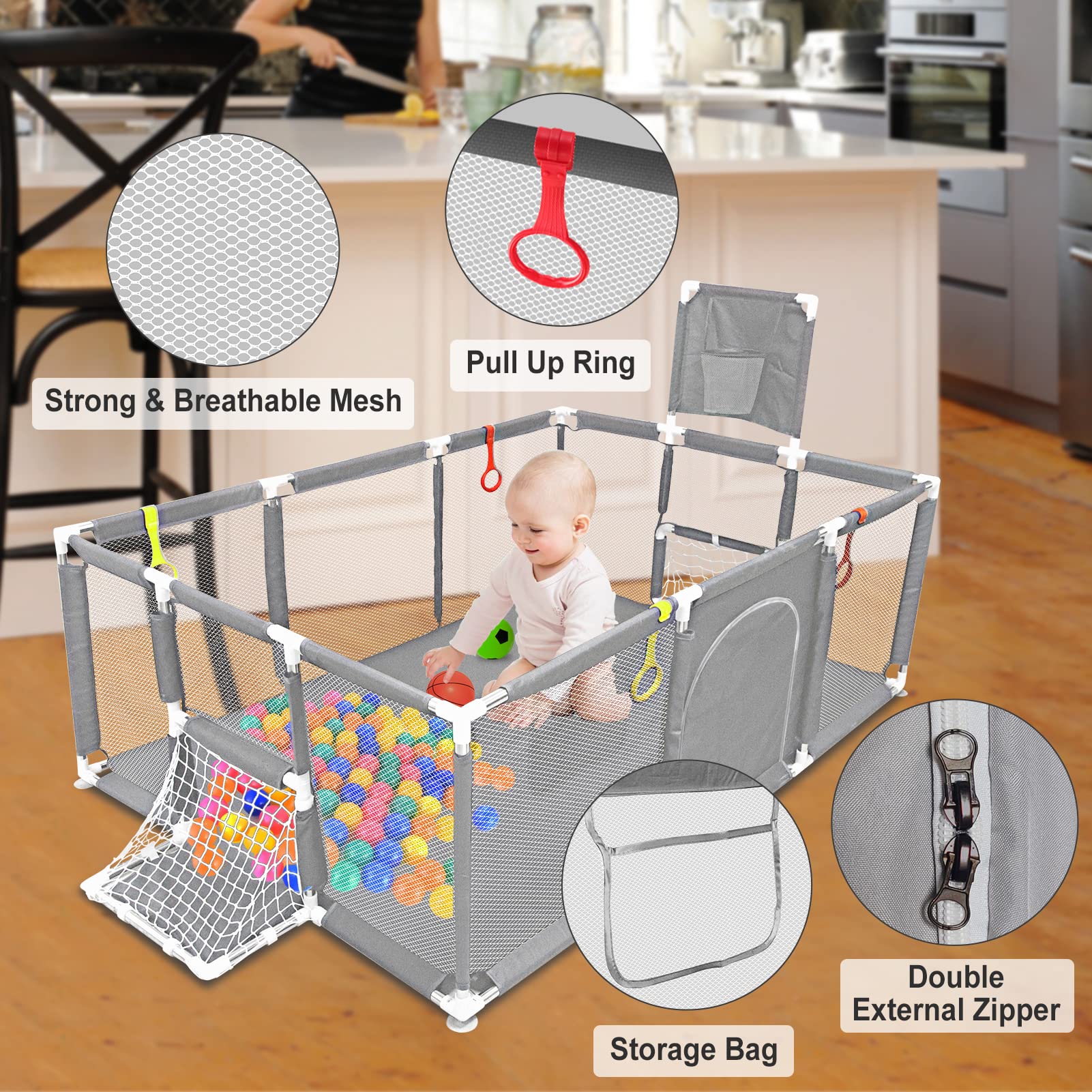 - Q: What is included in the package? A: The package includes 1 baby playpen, 1 installation manual, 1 storage bag, 4 pull-up rings, and a basketball hoop. Please note that balls are not included.