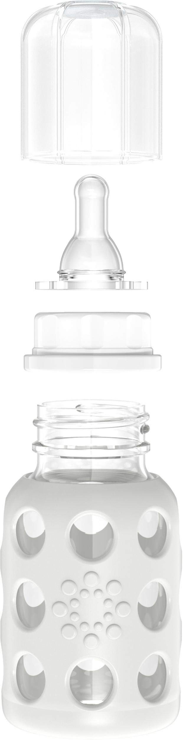 - Q: What components are included with the Lifefactory baby bottle? A: The bottle includes a 4-ounce glass container, a Stage 1 silicone nipple, a polypropylene cap, a ring, and a stopper.
