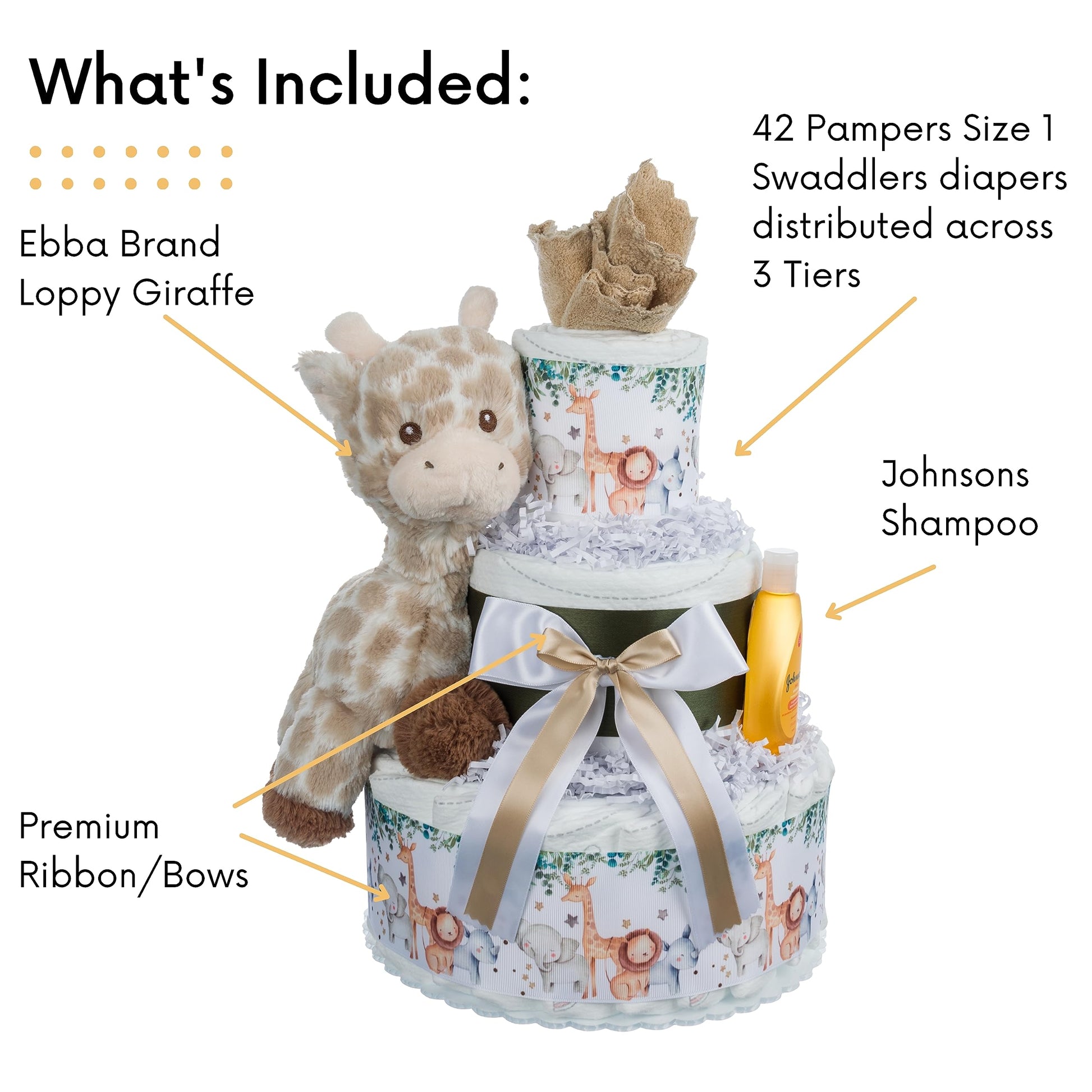 - Q: What is included in the Lil' Baby Cakes Safari Diaper Cake? A: The Lil' Baby Cakes Safari Diaper Cake includes 42 size 1 Swaddler diapers, an adorable plush giraffe named 'Loppy', a soft washcloth, Johnson's baby shampoo, and optional personalized gift messaging.