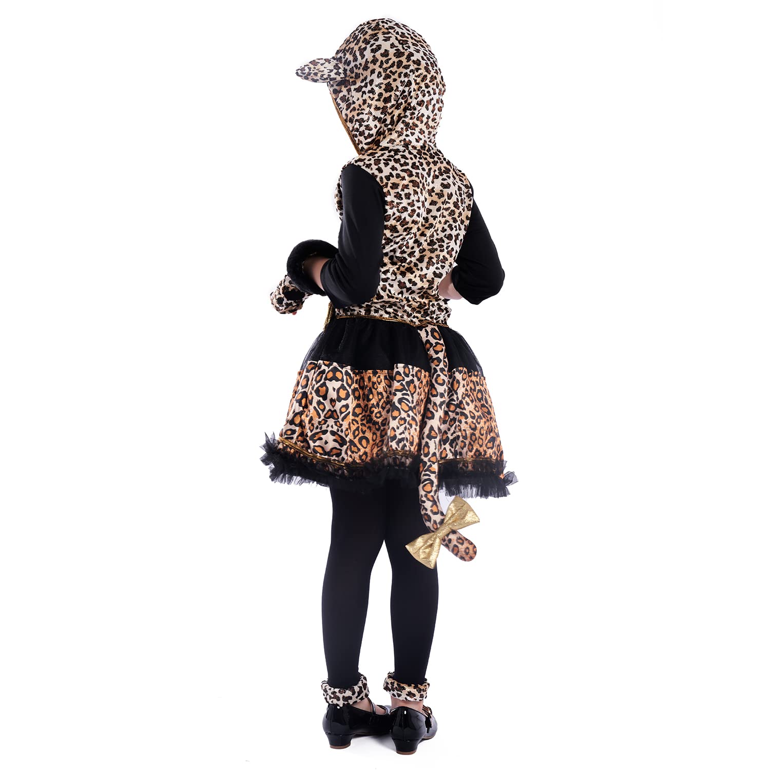 - Q: What is included in the Cheetah Costume set? A: The Cheetah Costume set includes a leopard costume dress, a pair of furry glovelettes with embroidered details, a pair of leggings with leopard fabric trim, and a tail to complete the outfit.