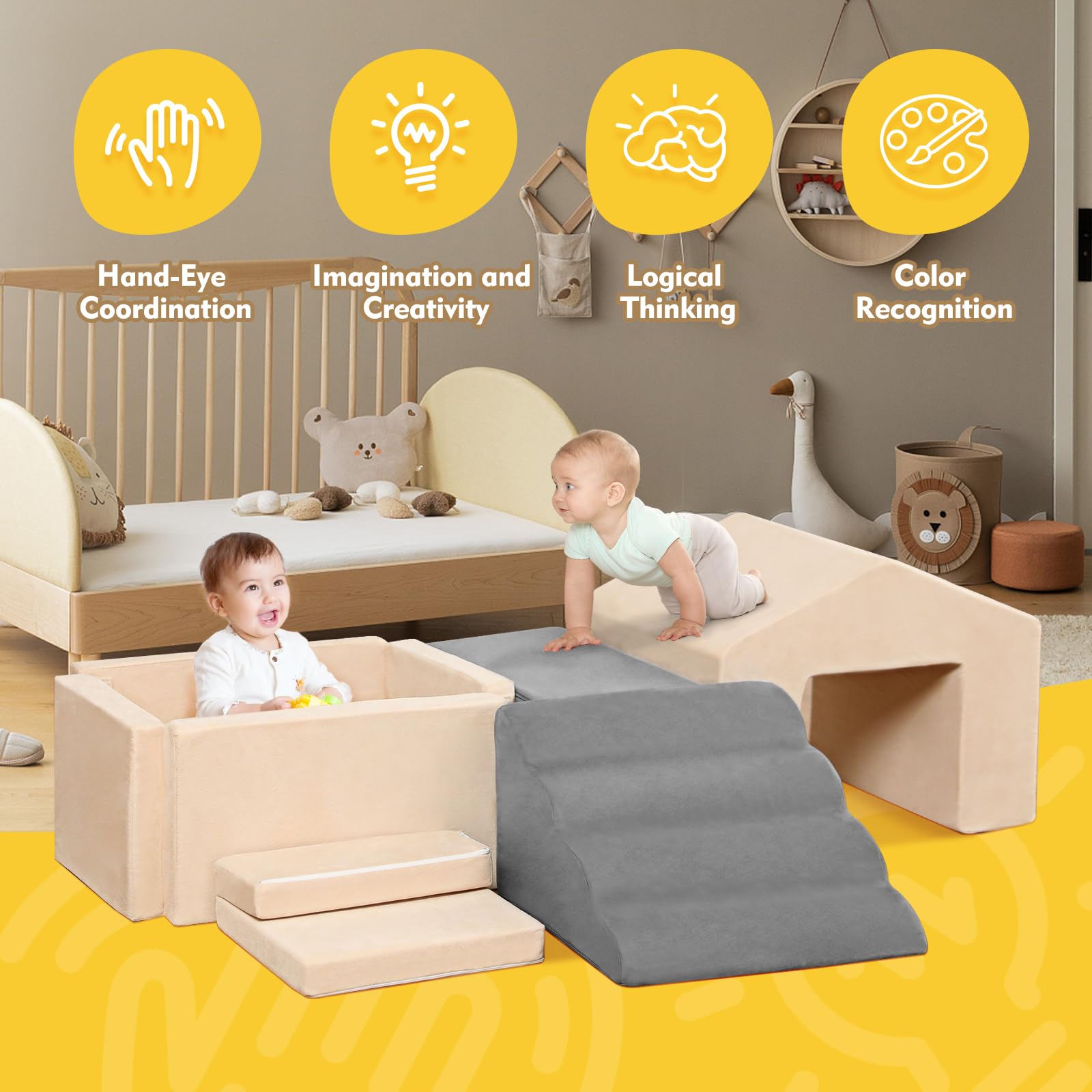 - Q: How many pieces are included in the climbing playset? A: The set includes six pieces: climbing blocks, a ball pit, a house block, a four-tier stair, and a foldable slope block.