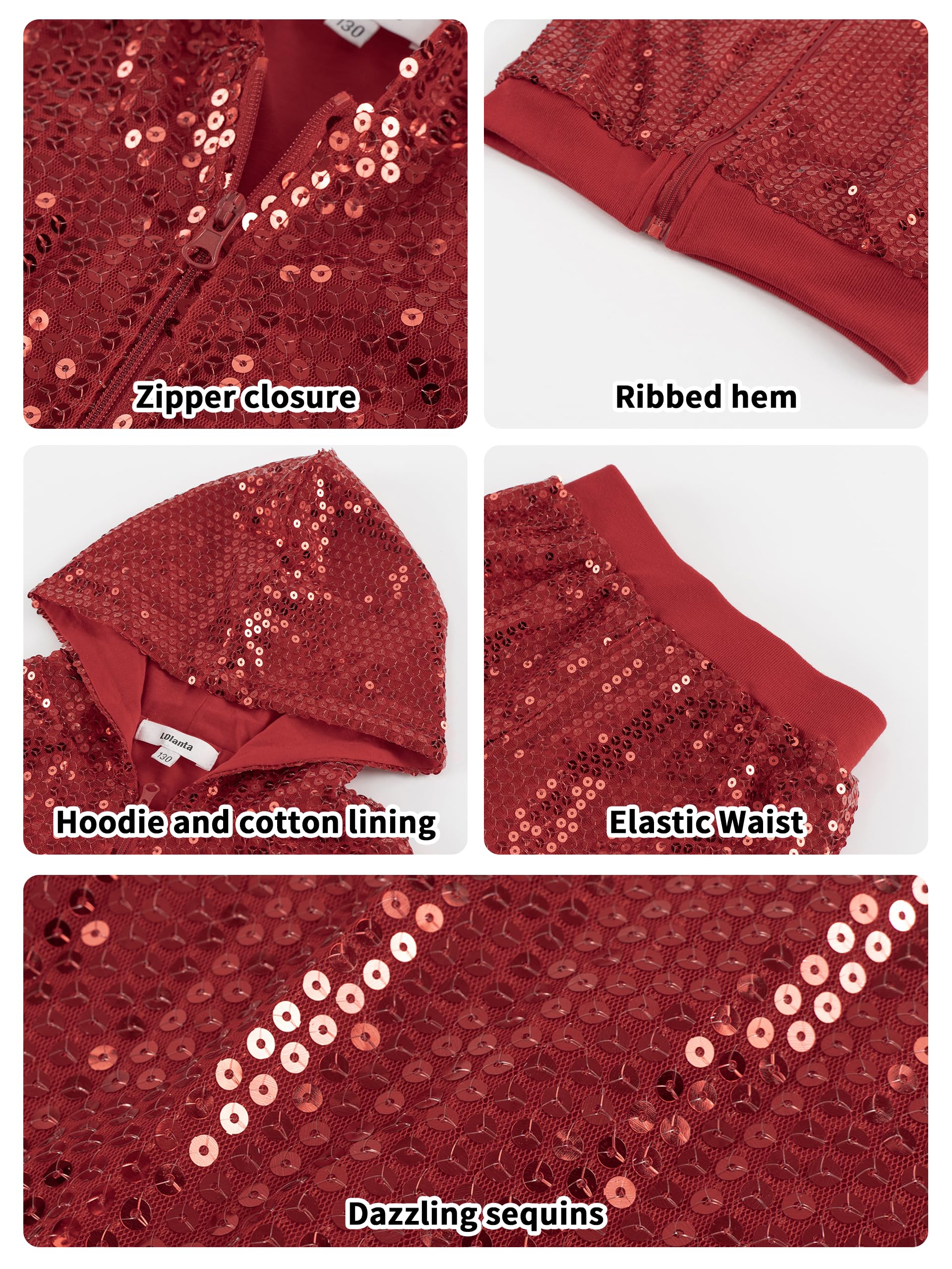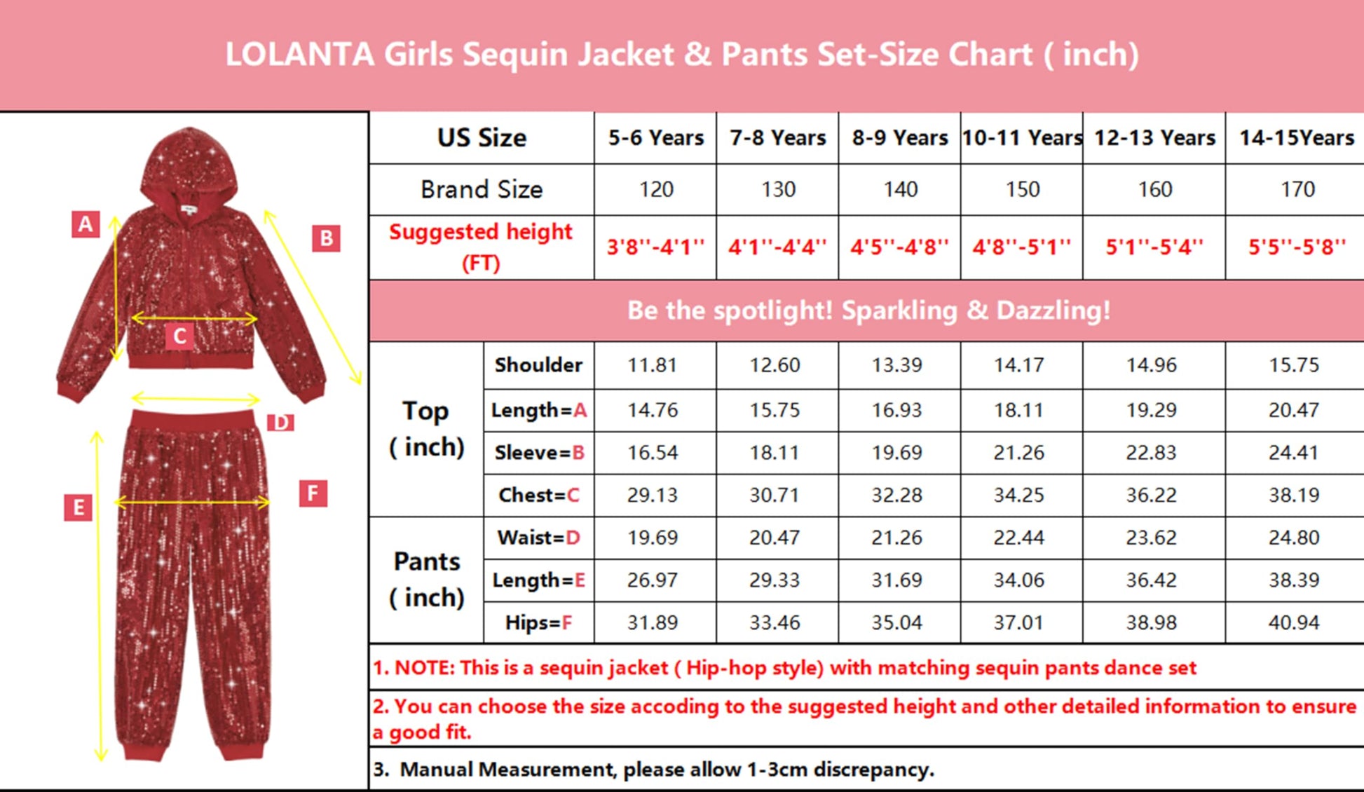 - Q: Does the outfit come with a matching set? A: Yes, the LOLANTA Girls Hip-hop Dance Costumes include a matching cropped sequin jacket and sequin pants, designed to create a complete and stylish dance ensemble.