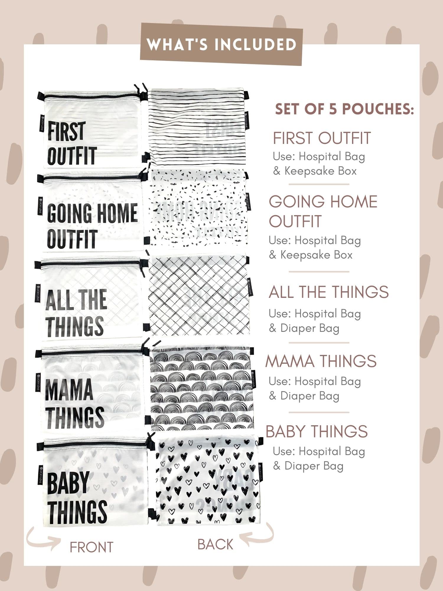 - Q: What labels are included on the pouches? A: The pouches are labeled as follows: Mama Things, Baby Things, All The Things, First Outfit, and Going Home Outfit.