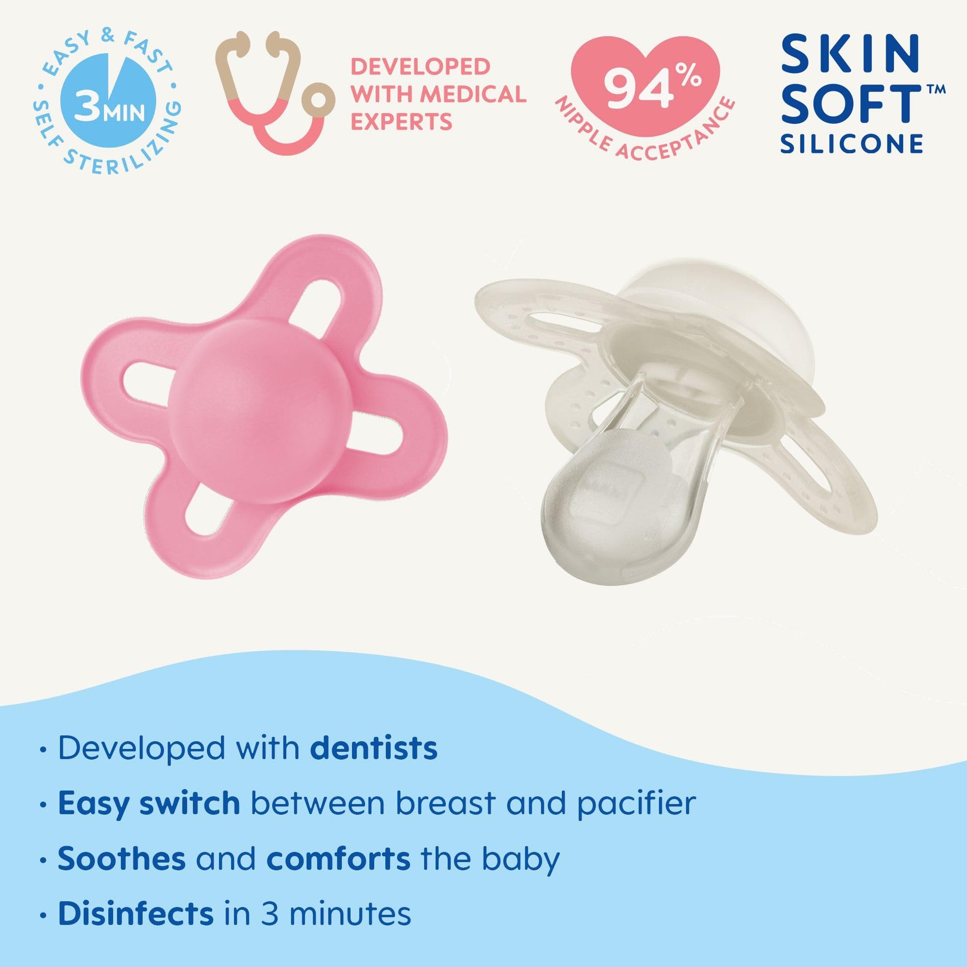 - Q: Are there any special instructions for using the self-sterilizing case? A: Yes, fill the self-sterilizing case with water, place the pacifier inside with the nipple facing down, and follow the microwave settings as per the package instructions.