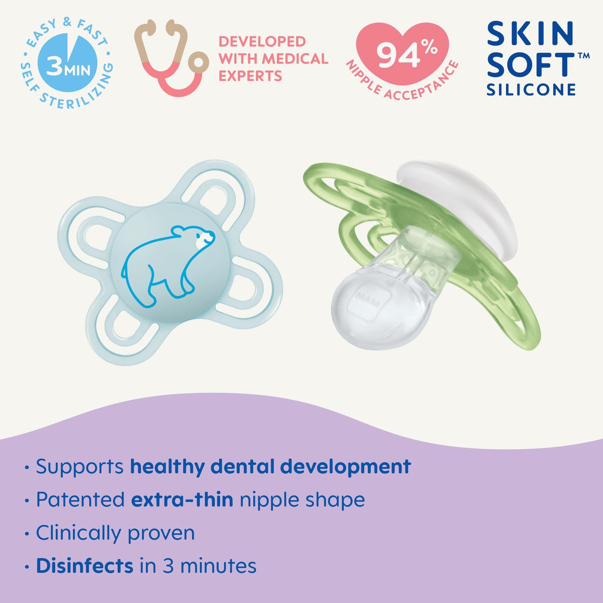 - Q: What makes the nipple of the MAM Perfect Pacifier more acceptable to babies? A: The nipple is designed to be life-like with SkinSoft textured silicone, which feels natural and comfortable for babies, contributing to a 94% acceptance rate.