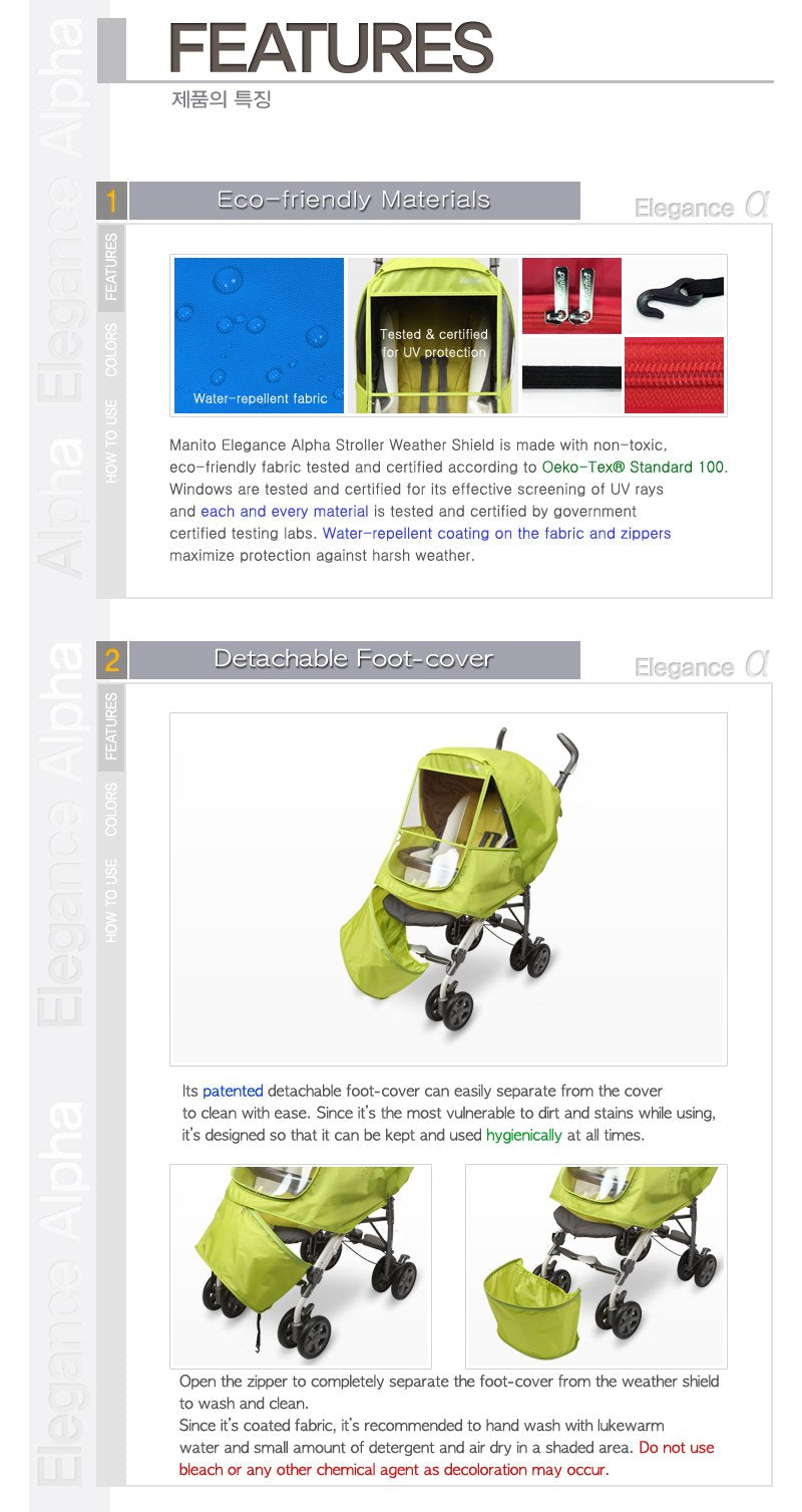 - Q: Is the Manito Elegance Alpha Stroller Weather Shield easy to install? A: Yes, the stroller cover has a handle insert type design and a bottom clip for easy and secure installation. Additionally, elastic S-hooks help to securely fix the cover onto the stroller, preventing it from blowing off in strong winds.