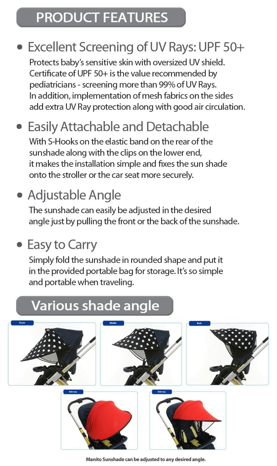 - Q: Is the Manito Sun Shade compatible with all strollers? A: The sun shade is designed to be compatible with most strollers and car seats, but it requires the stroller to have a basic canopy for proper use.