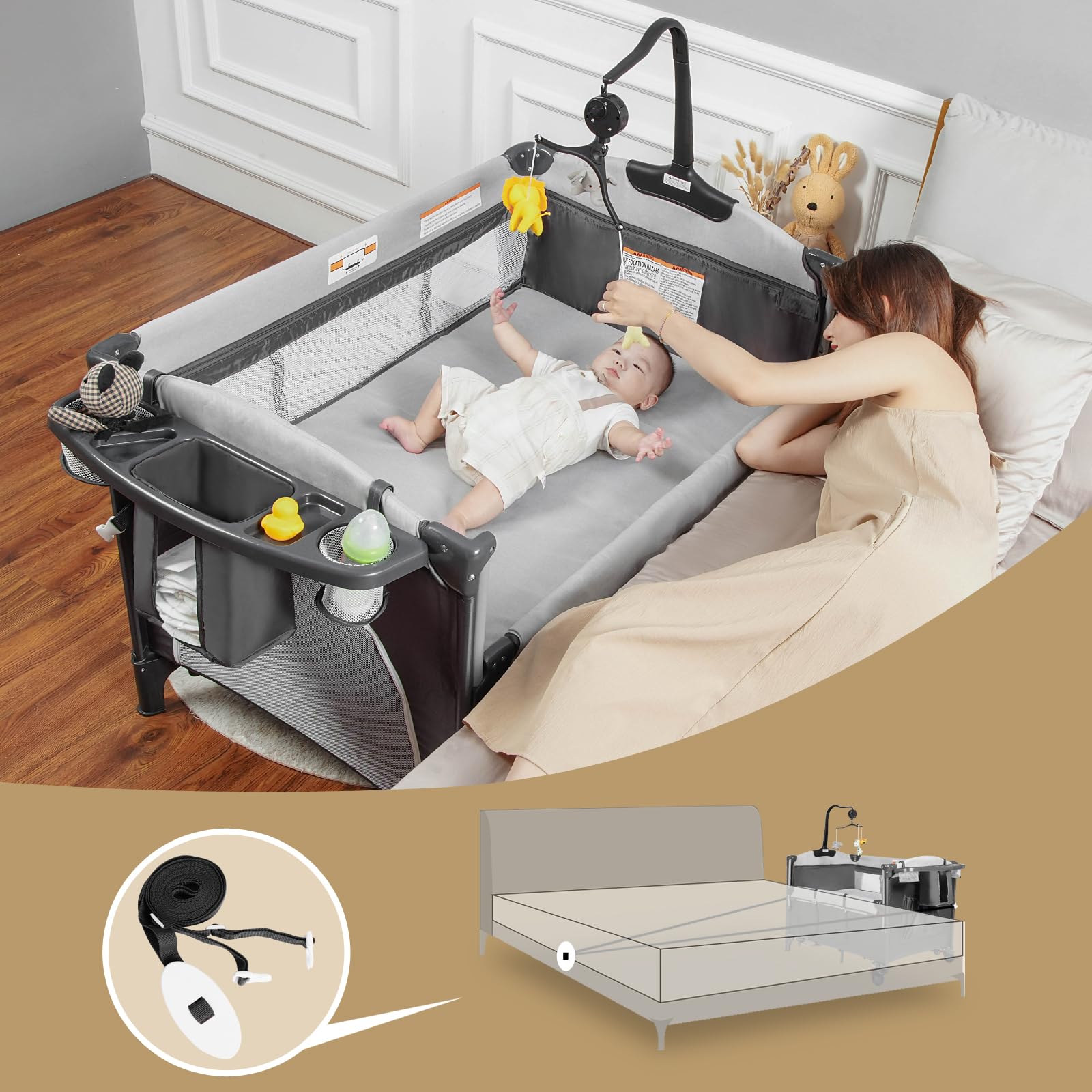 - Q: What features does the 5-in-1 Pack and Play offer? A: The 5-in-1 Pack and Play includes a bassinet, bedside sleeper, play yard with a zipper door, diaper changing table, and a convenient storage tray.