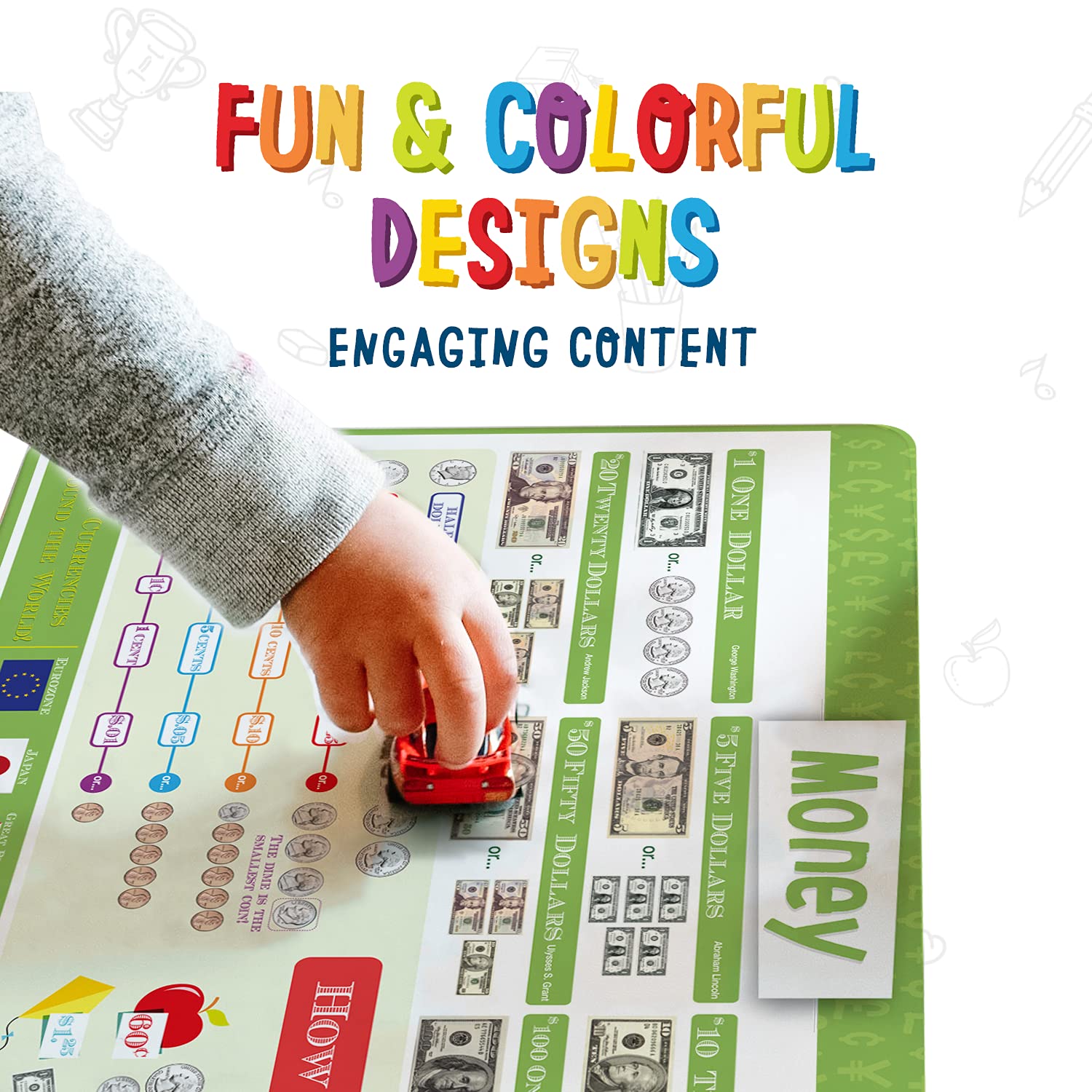 - Q: What topics do the educational placemats cover? A: The placemats cover essential topics such as telling time, counting money, the 12 months of the year, days of the week, holidays, and the four seasons.