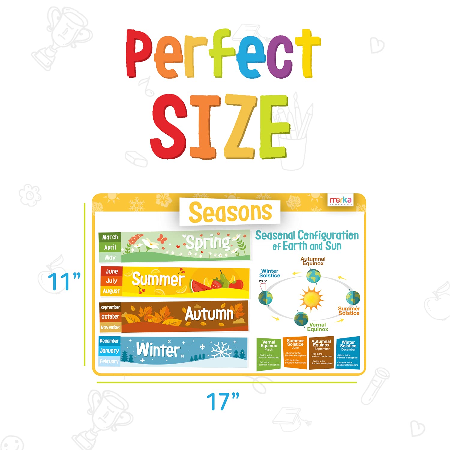 - Q: What size are the merka educational placemats? A: Each placemat measures 17 inches wide by 11 inches tall, making them an ideal size for use on kitchen counters or dining tables.
