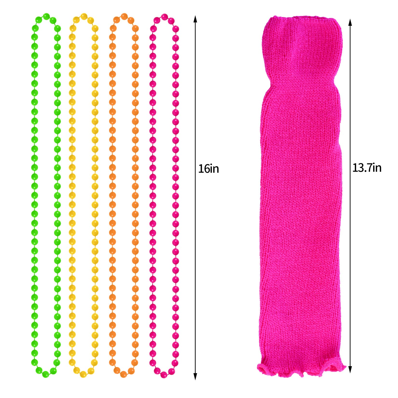 - Q: What colors are the accessories in the costume set? A: The costume set includes a multicolor rainbow skirt, rose red gloves and leggings socks, a solid color neon necklace, and vivid colored bracelets.