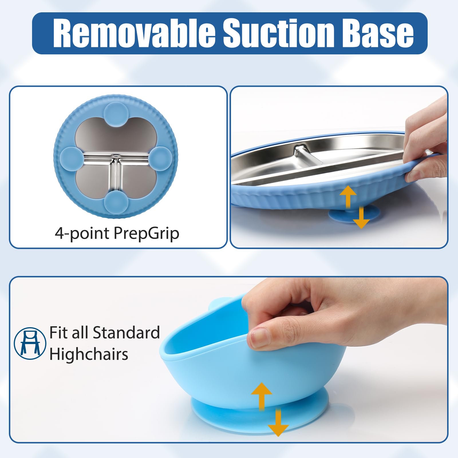 • Q: How does the suction base work on the plates and bowls? A: The plates and bowls feature a removable silicone suction base that securely attaches them to the table. This design prevents curious toddlers from knocking them over, helping to reduce spills and messes.