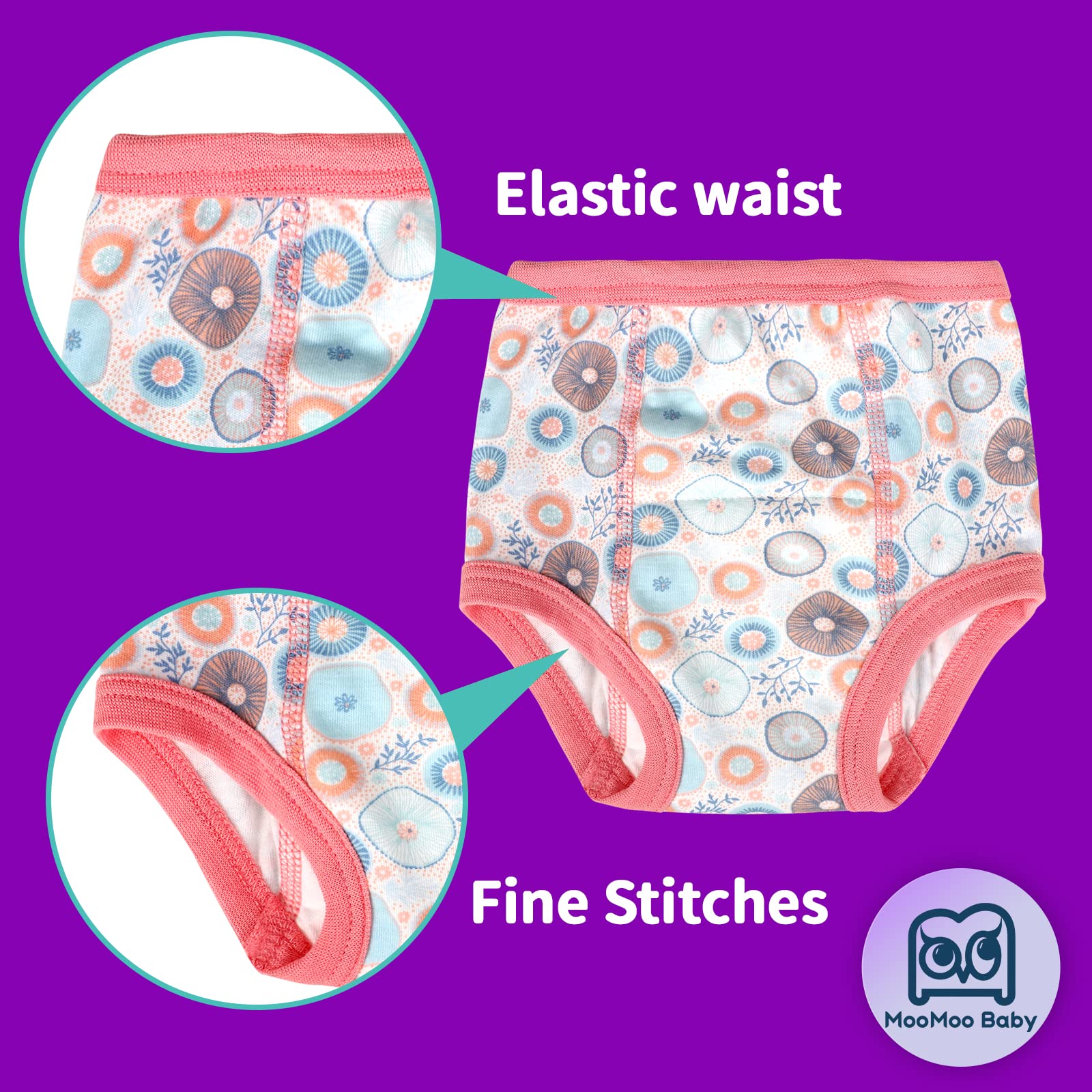 - Q: What sizes are available for the MooMoo Baby Training Underwear? A: The MooMoo Baby Training Underwear is available in sizes 2T, 3T, 4T, 5T, 6T, and 7T. Each size corresponds to specific waist measurements, heights, and weight ranges.