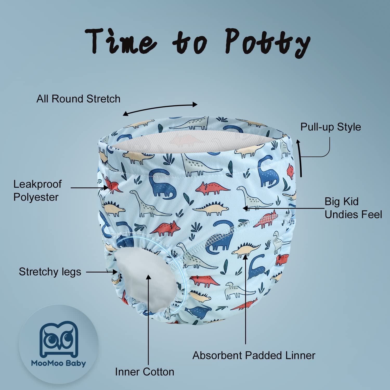- Q: What is the design of MooMoo Baby training pants? A: MooMoo Baby training pants come in cute patterns that appeal to toddlers, making potty training a more enjoyable experience.