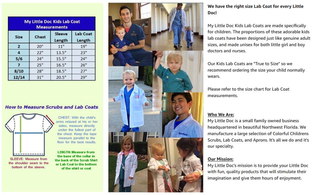 - Q: Are there other sizes available for this lab coat? A: Yes, the My Little Doc Kids Lab Coat is available in various sizes, including 2, 4, 5/6, 7, 8/10, and 12/14.