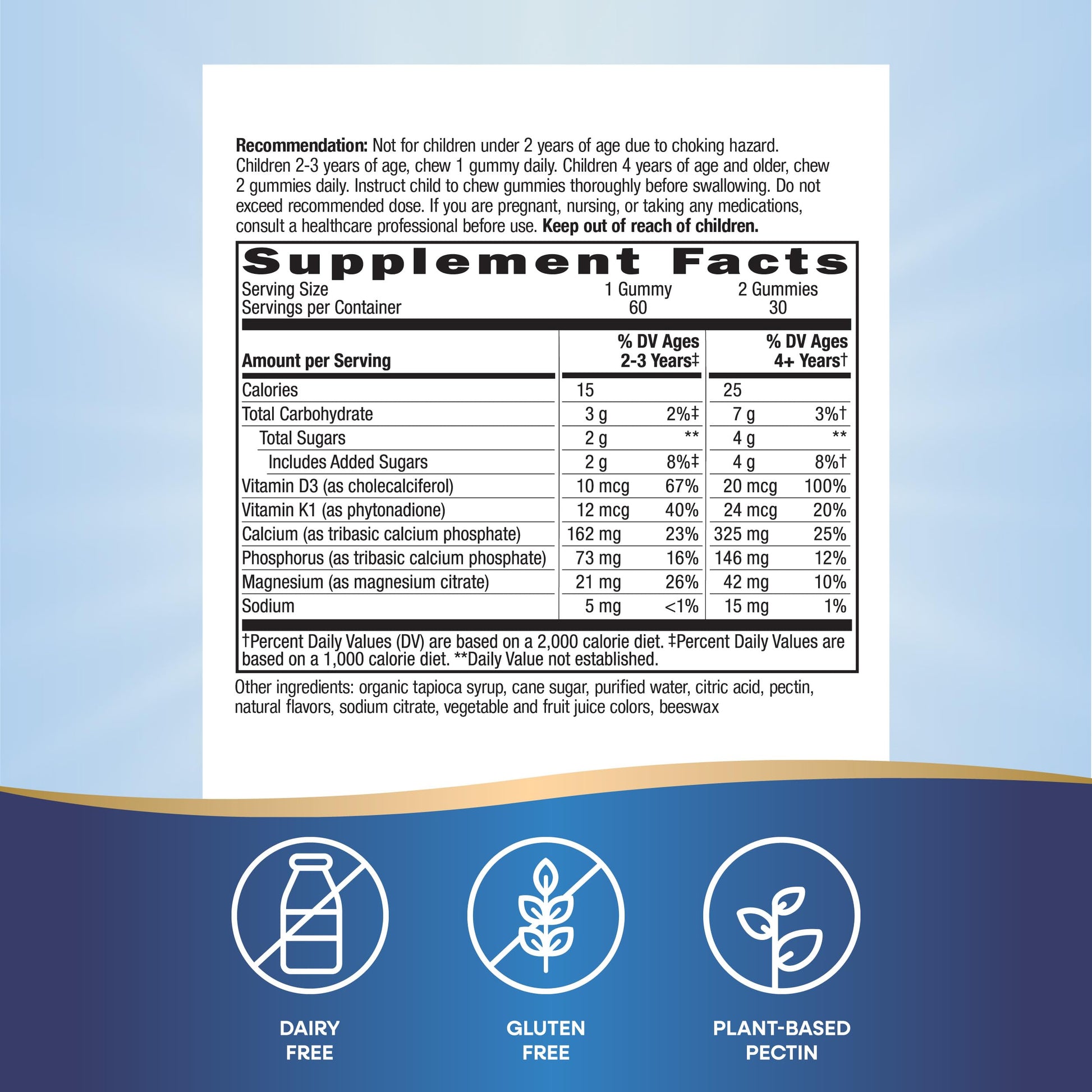 - Q: What are the main ingredients in these gummies? A: The gummies are made with calcium, vitamin D, vitamin K1, and magnesium, along with wholesome ingredients like organic tapioca syrup and cane sugar.