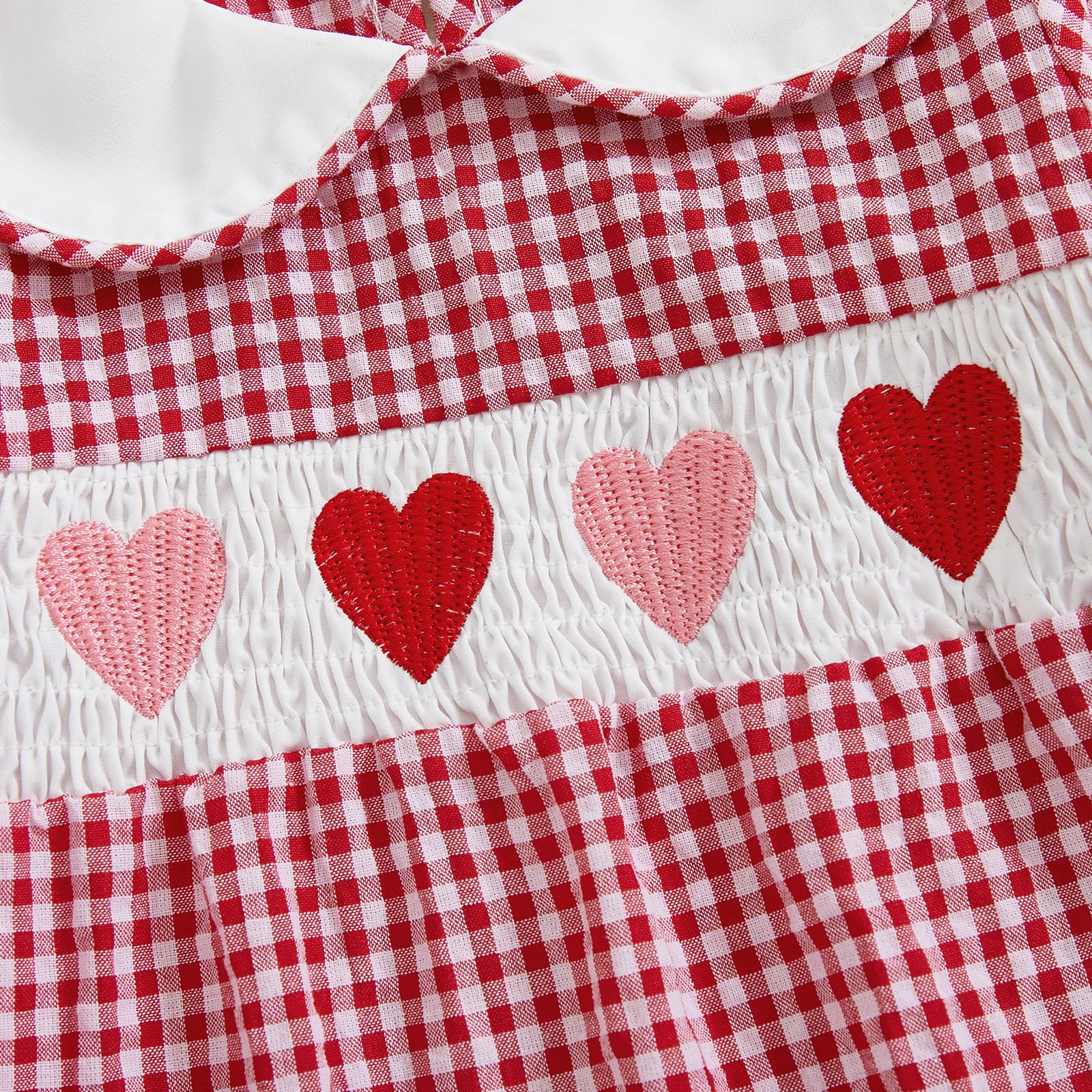 - Q: Does the romper have any special design features? A: Yes, the romper features a doll collar, heart embroidery, and a plaid pattern, which adds to its cute and festive look.
