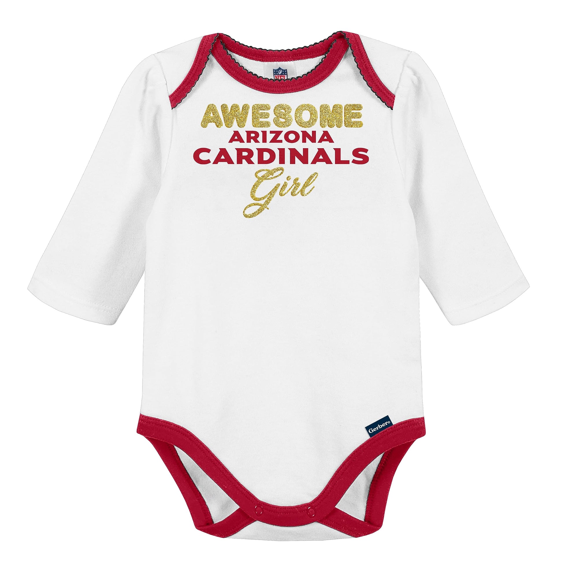 - Q: What colors are featured in the outfit? A: The outfit features team colors with gold glitter words and screen print art of the Arizona Cardinals.