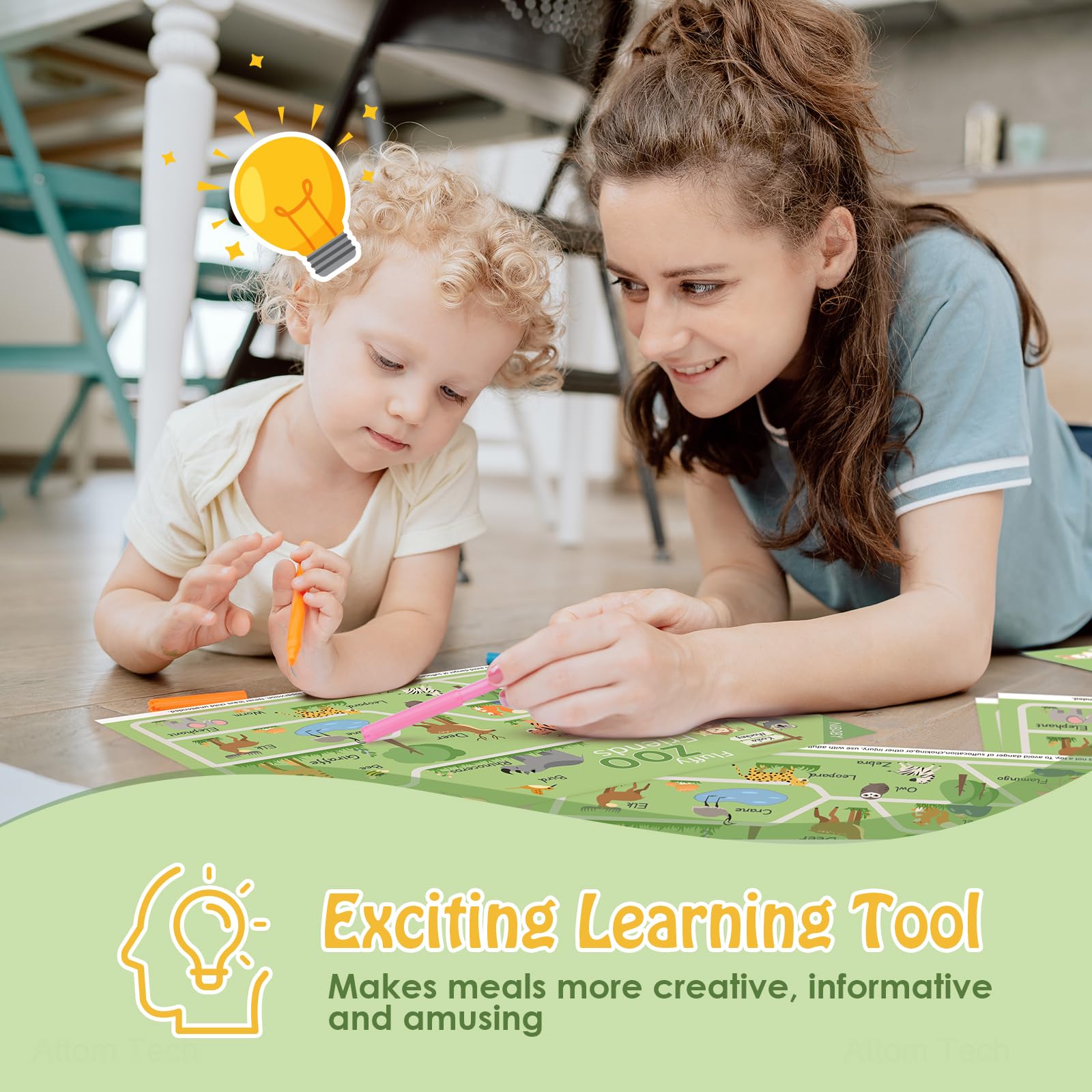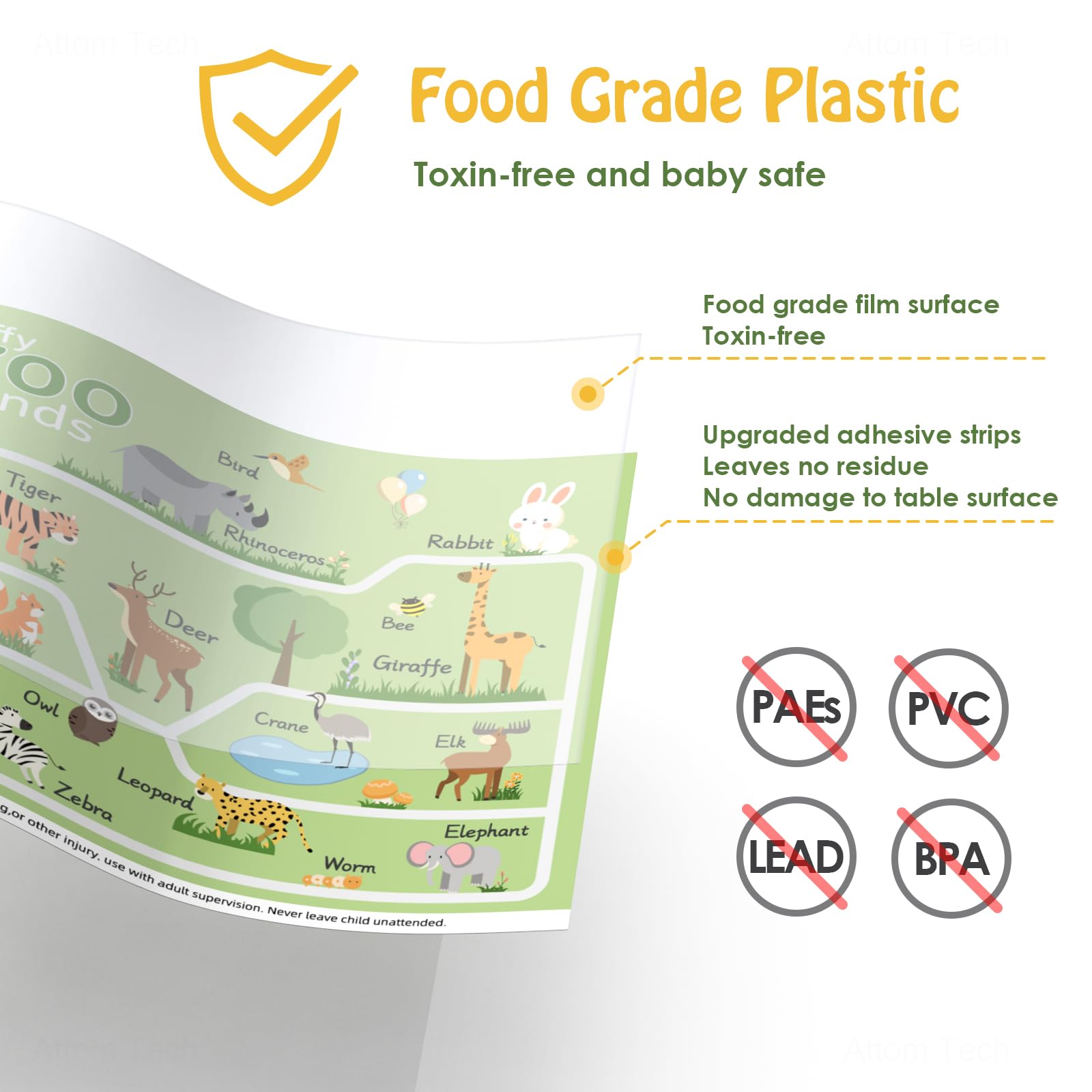 - Q: What features make these placemats educational? A: The placemats feature fun animal designs and learning elements like the alphabet, which can help enhance your child's vocabulary and understanding of numbers, shapes, and colors while they eat.