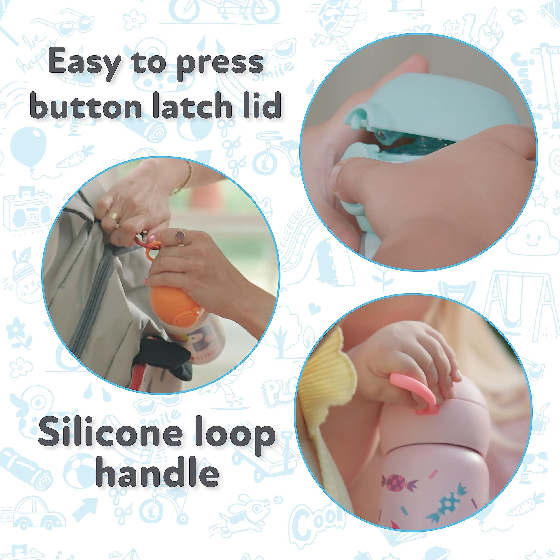 • Q: Is the cup easy for toddlers to use? A: Yes, toddlers can easily flip the latch and press the button to access the straw, encouraging independent drinking.