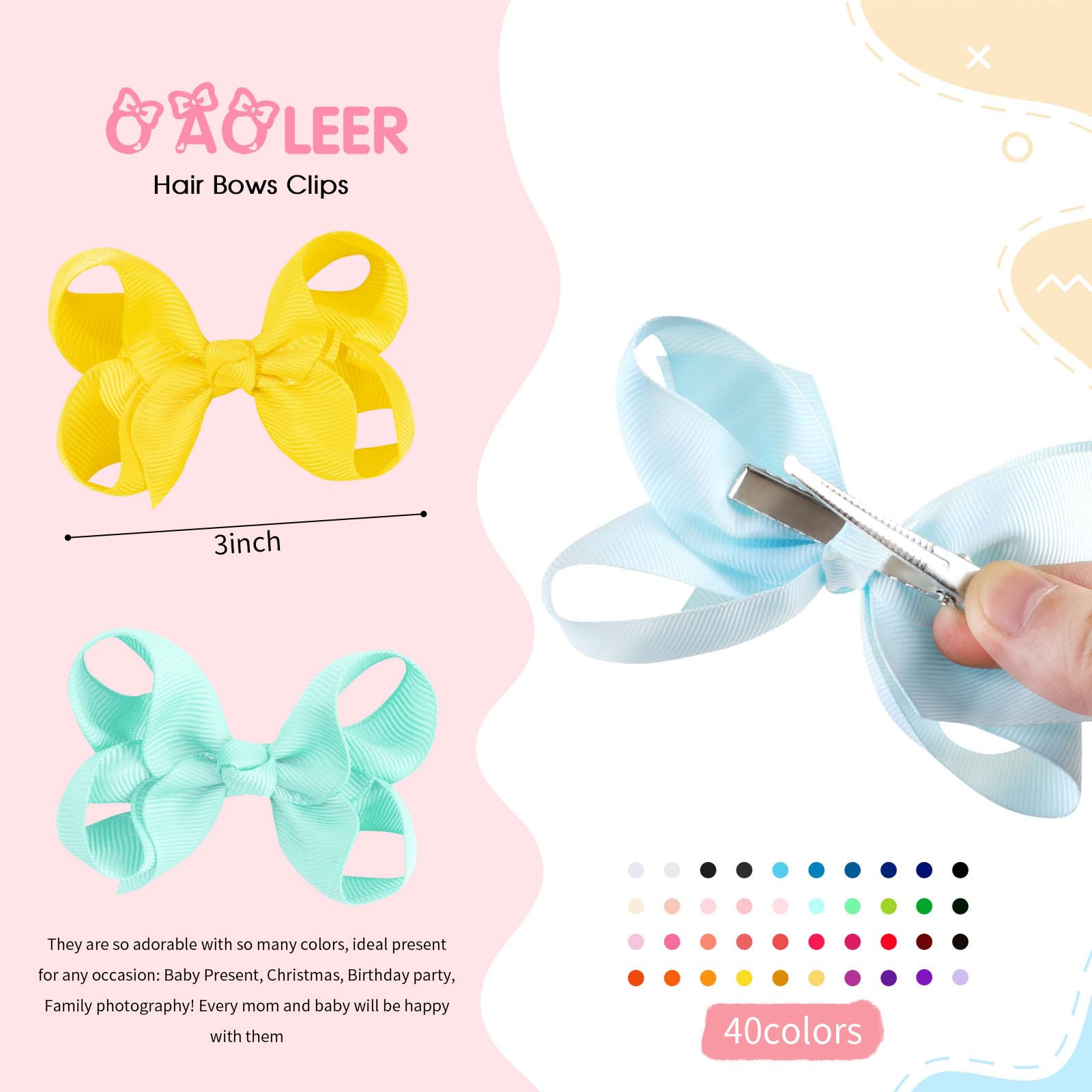 - Q: How many hair bows are included in the pack? A: The pack includes 40 hair bows in different colors.
