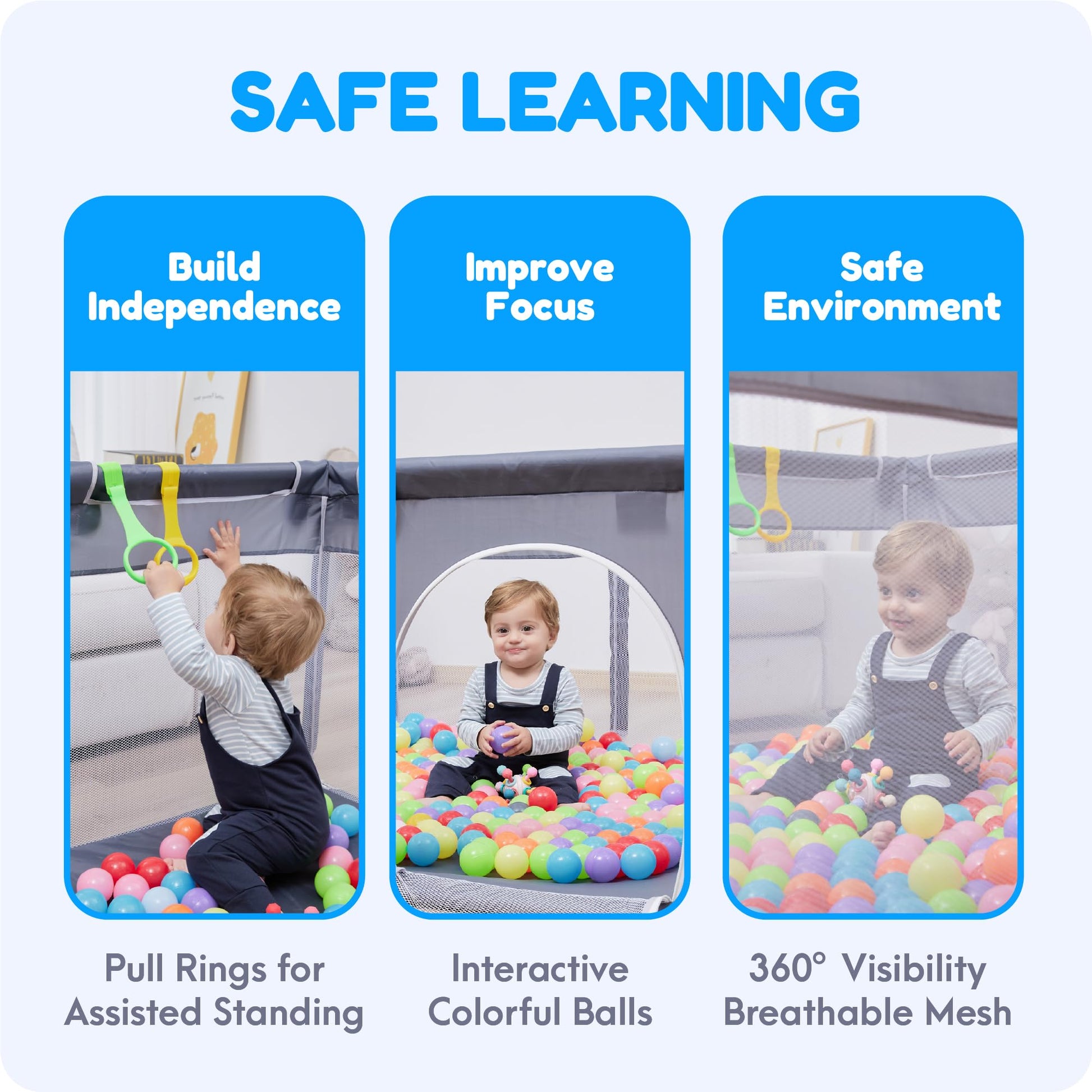 - Q: How does the 360-degree mesh design enhance safety? A: The 360-degree mesh walls allow parents to keep an eye on their child from all angles, providing visibility and ensuring a safe play environment.