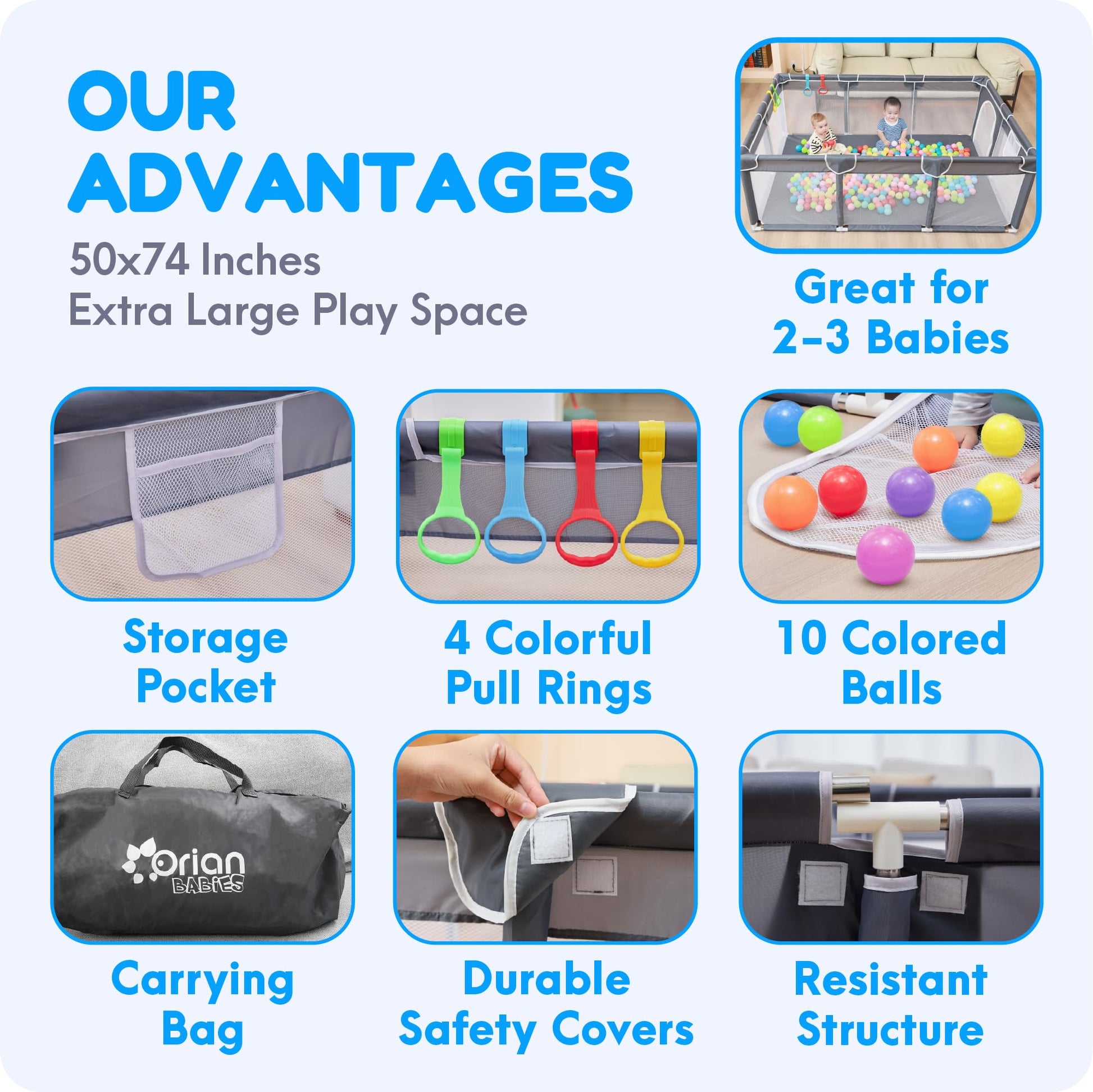 - Q: Does the playpen come with any accessories? A: Yes, the Orian Baby Playpen includes 10 colorful balls, 4 pull rings to support standing, and a convenient carry bag for easy transport.