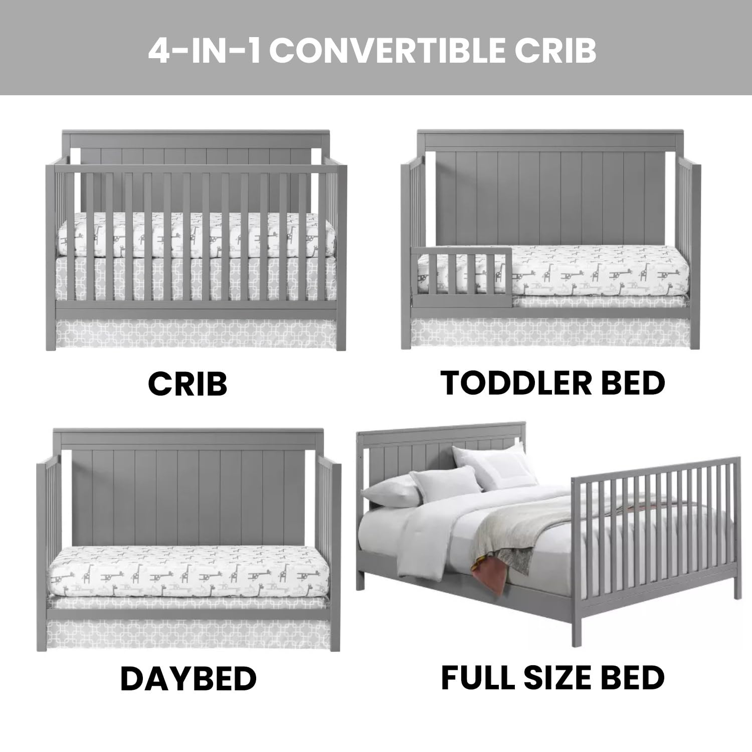 - Q: What does '4-in-1 convertible' mean? A: The crib can be converted into a toddler bed, daybed, and full-size bed, allowing it to grow with your child.