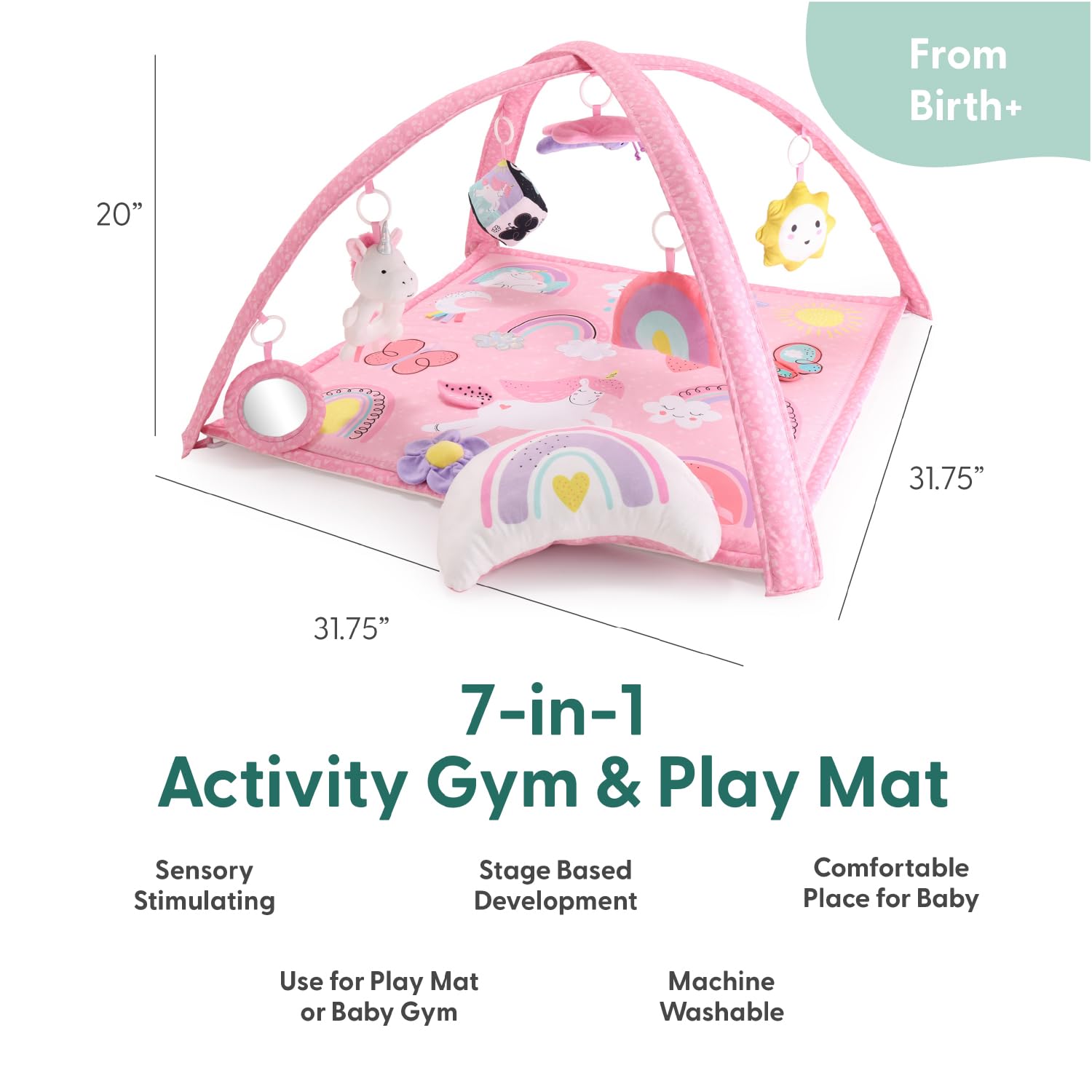 - Q: What features does the Rainbow Adventure Baby Activity Play Gym include? A: The play gym includes a vibrant rainbow theme with unicorns and butterflies, a plush padded mat, interactive hanging toys, and a simple setup for home or travel.