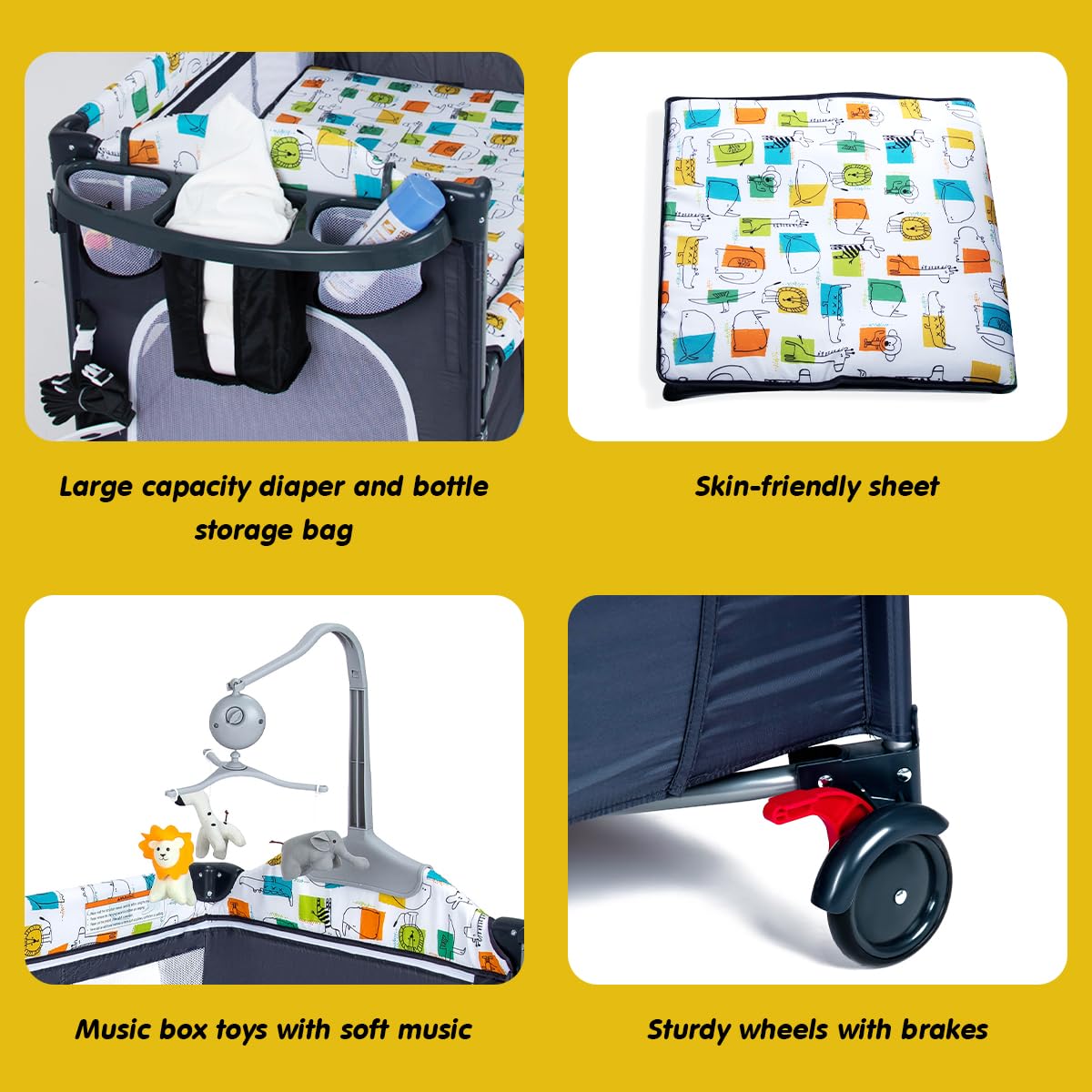 - Q: What are the storage options available with the bassinet? A: The bassinet features a large storage bag to conveniently store baby essentials like bottles and diapers, as well as additional pockets.