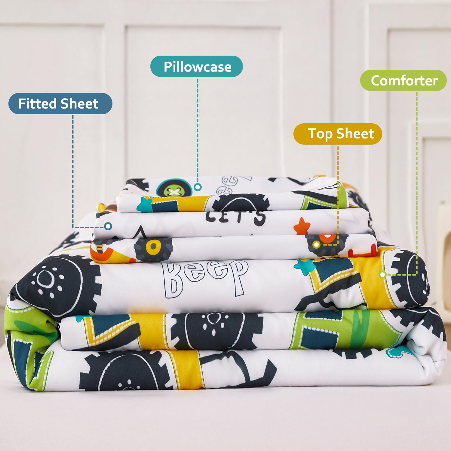 - Q: Is the design of the bedding set reversible? A: Yes, the toddler bedding set features a double-sided design with a colorful car print on both sides, allowing for versatile styling in your child's room.