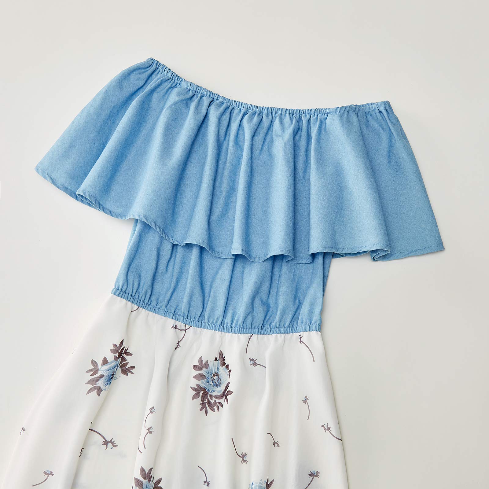 - Q: What is the design of the women's dress in this collection? A: The women's dress features an A-line shape with off-shoulder short sleeves and a ruffle design. It has an elastic waist to create a flattering silhouette.