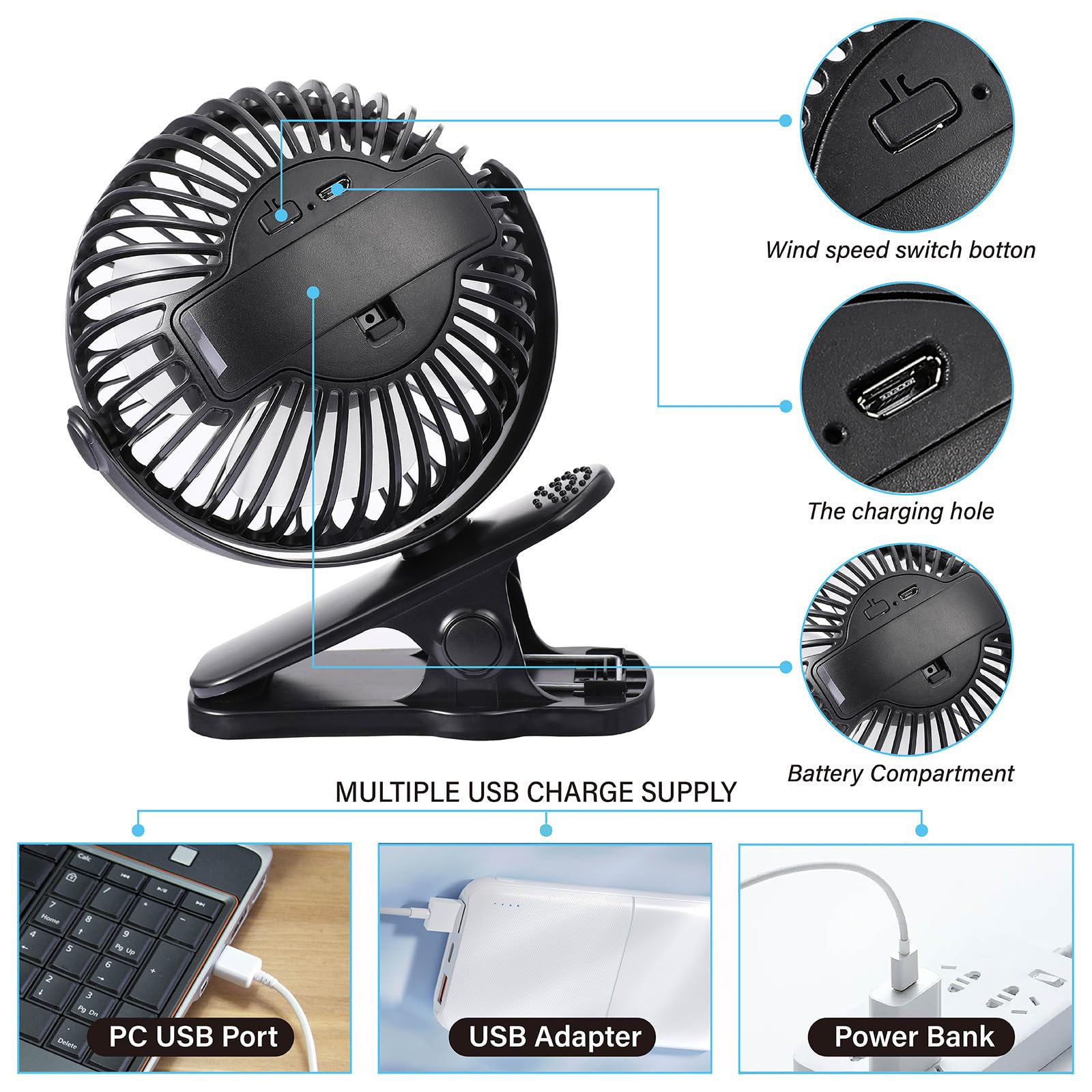 - Q: How can I power the fan? A: The fan can be powered via a USB connection to a computer, power bank, or USB charger.