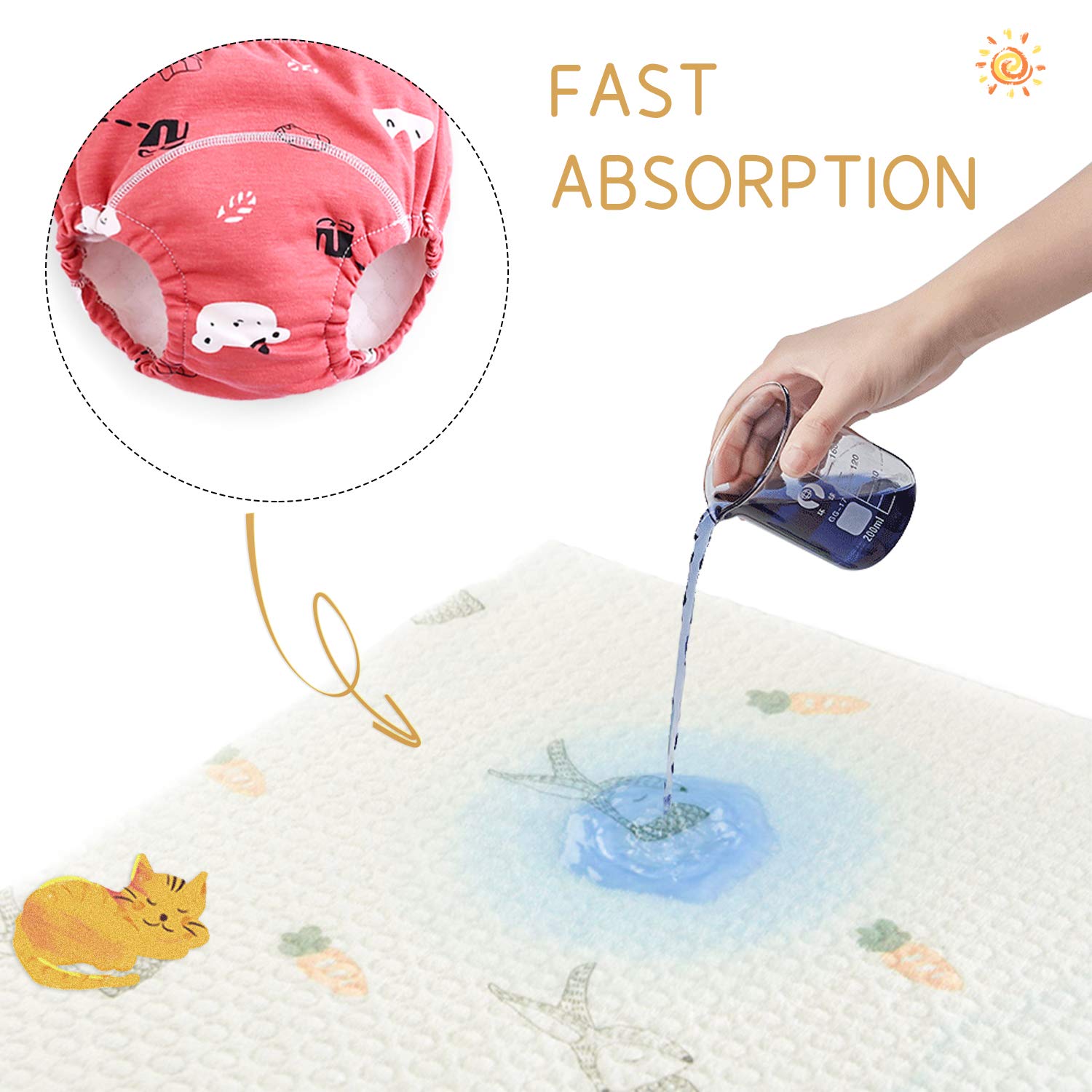 - Q: What materials are used in these training pants? A: These training pants are made from natural and safe cotton, with an outer layer of 100% cotton and inner layers of cotton, muslin, and TPU for added softness and absorption.