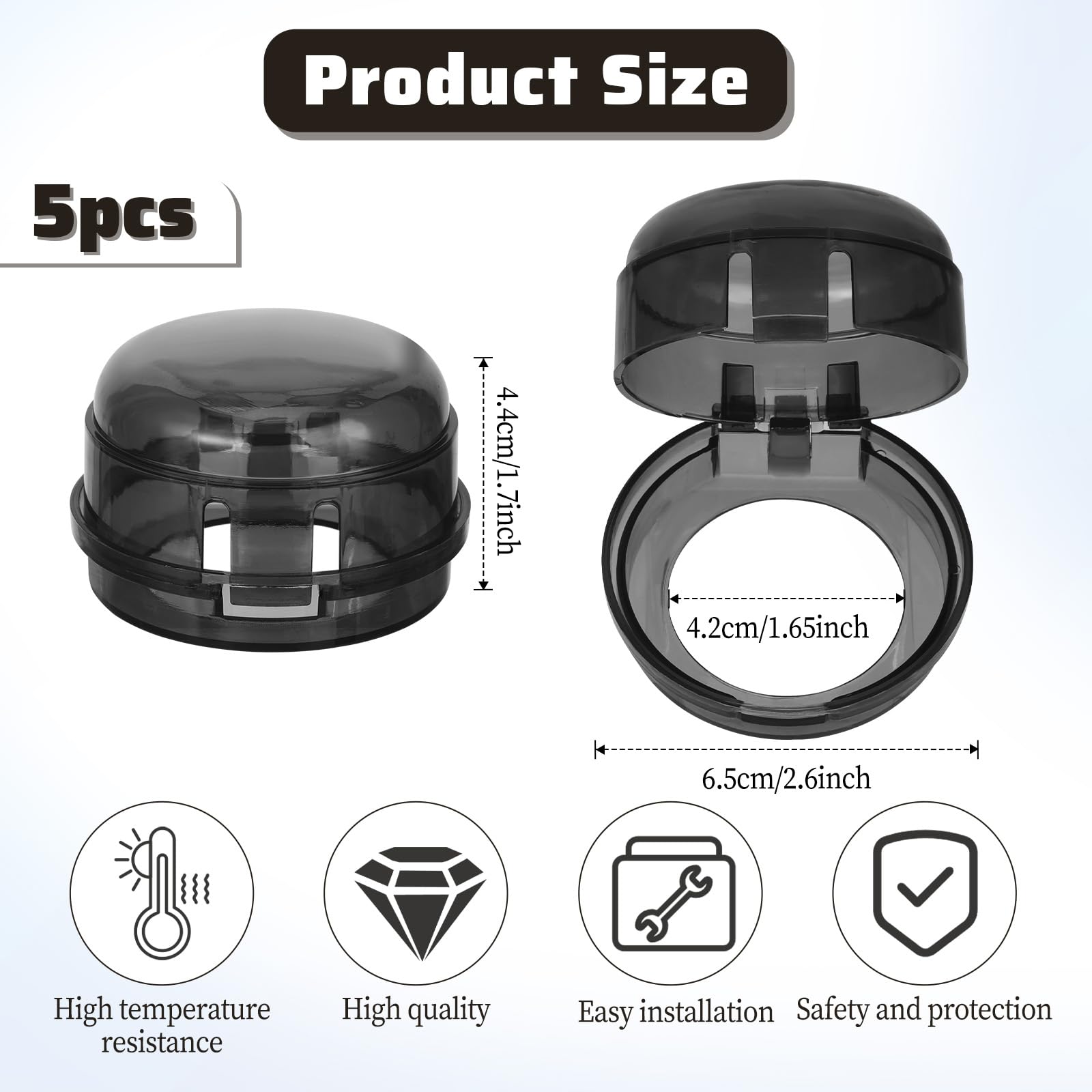 - Q: What size are the stove knob covers? A: The external diameter of the stove knob covers is 2.6 inches, the height is 1.7 inches, and the inner diameter of the bottom hole is 1.65 inches, making them compatible with most household stove knobs.