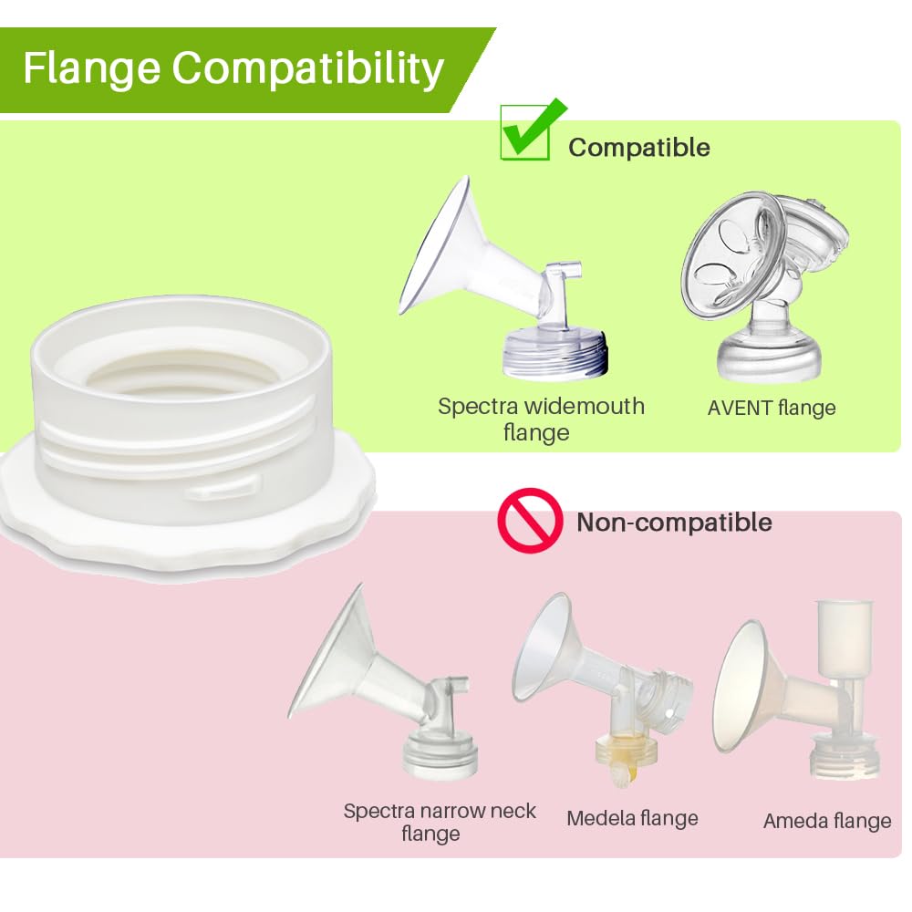 - Q: Can this adapter be used with Avent and Spectra bottles? A: Yes, the adapter is compatible with Avent and Spectra S1/S2 wide-mouth flanges for use with standard-sized bottles.
