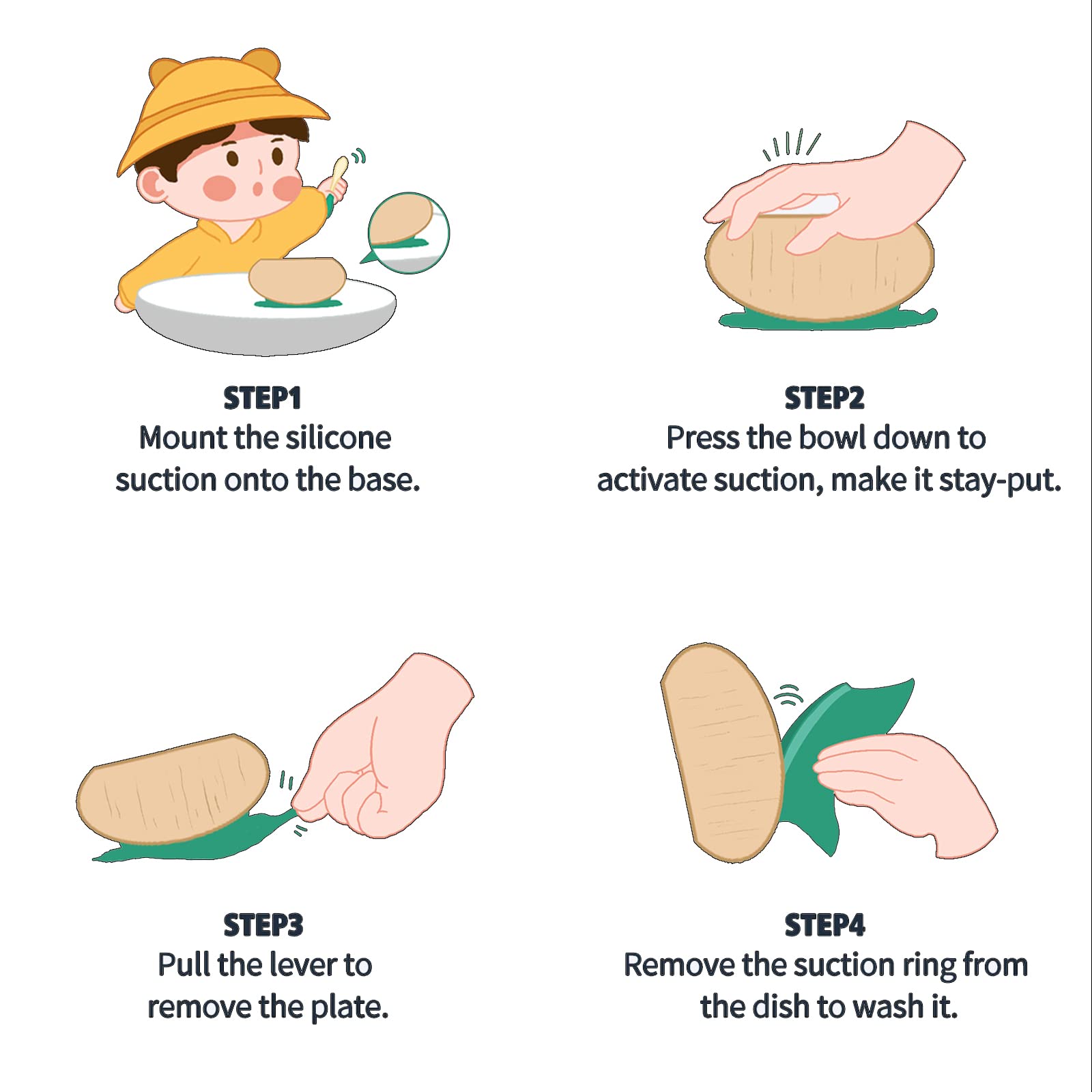 - Q: How do the suction features work? A: The suction base securely adheres to any smooth surface, preventing the plate from flipping or spilling during mealtime.