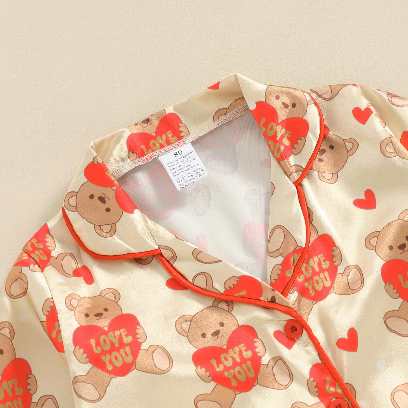 - Q: Do the pajamas have any special designs? A: Yes, the pajamas feature a loved bear print on the top, adding a cute and festive touch for Valentine's Day.