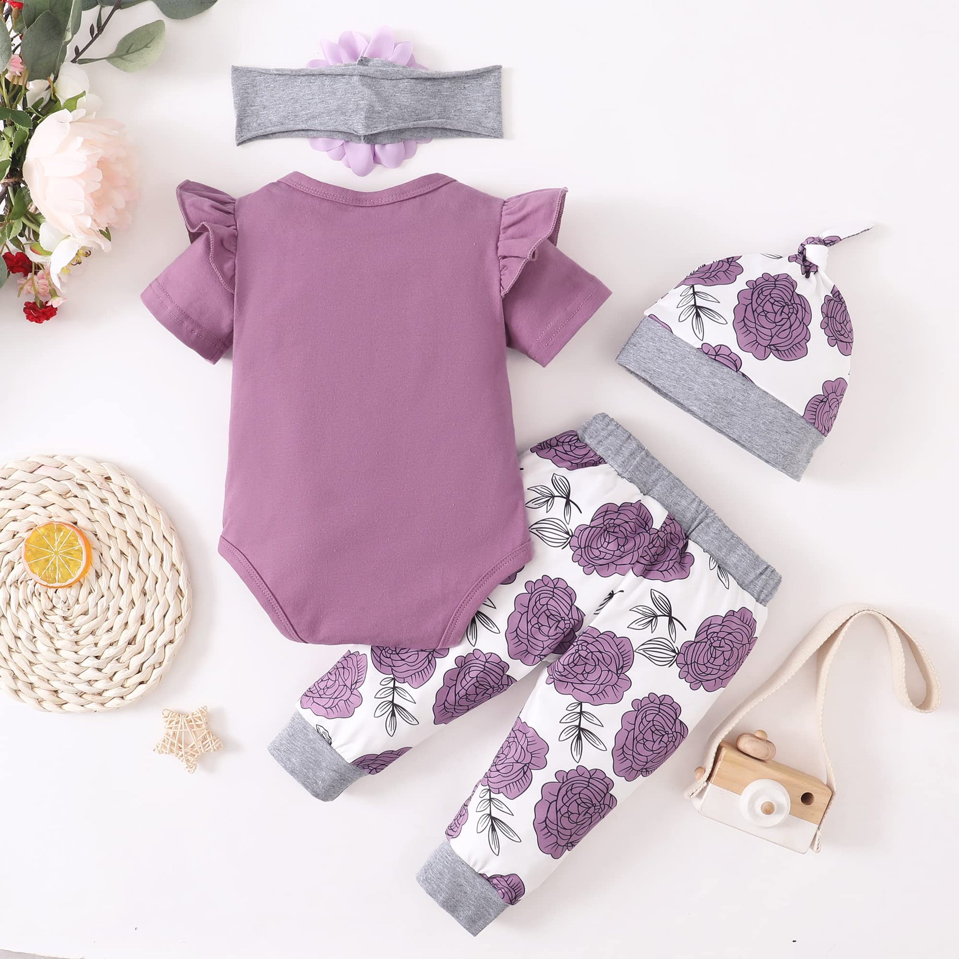 - Q: What items are included in this outfit set? A: The outfit set includes a short sleeve ruffled romper bodysuit, floral pants, and a matching bowknot headband.
