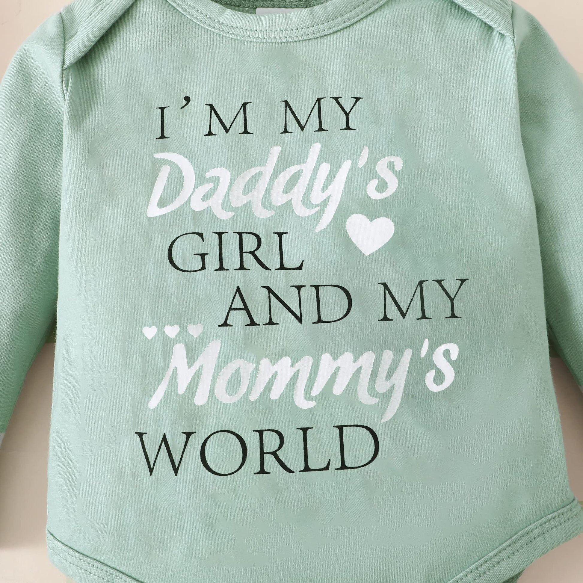 - Q: What design elements are included in this outfit? A: The outfit features a stylish flower pattern and the phrase 'I'M MY Daddy's GIRL AND MY Mommy's WORLD', adding a charming touch to the overall design.