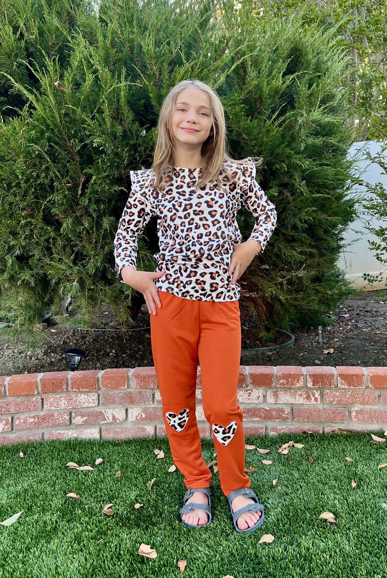 - Q: What design features can I expect from the outfit? A: The outfit includes a fleece pullover sweatshirt with a cute leopard print and long pants designed with an elastic waist.