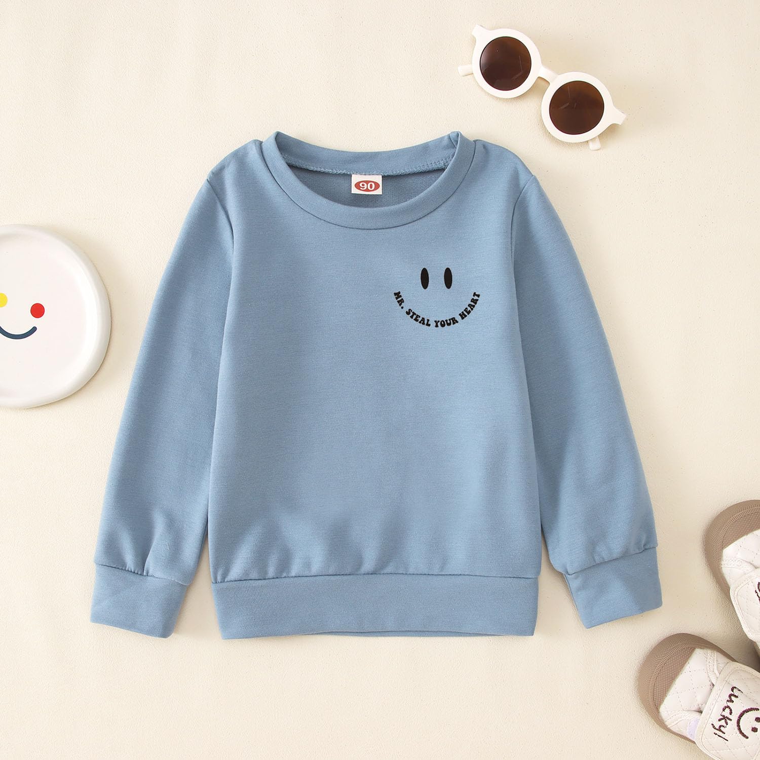 - Q: What type of design does the sweatshirt feature? A: The sweatshirt features a smile letter graphic on the front and 'Mr. Steal Your Heart' waved letter print on the back, making it a fun and stylish choice for toddlers.