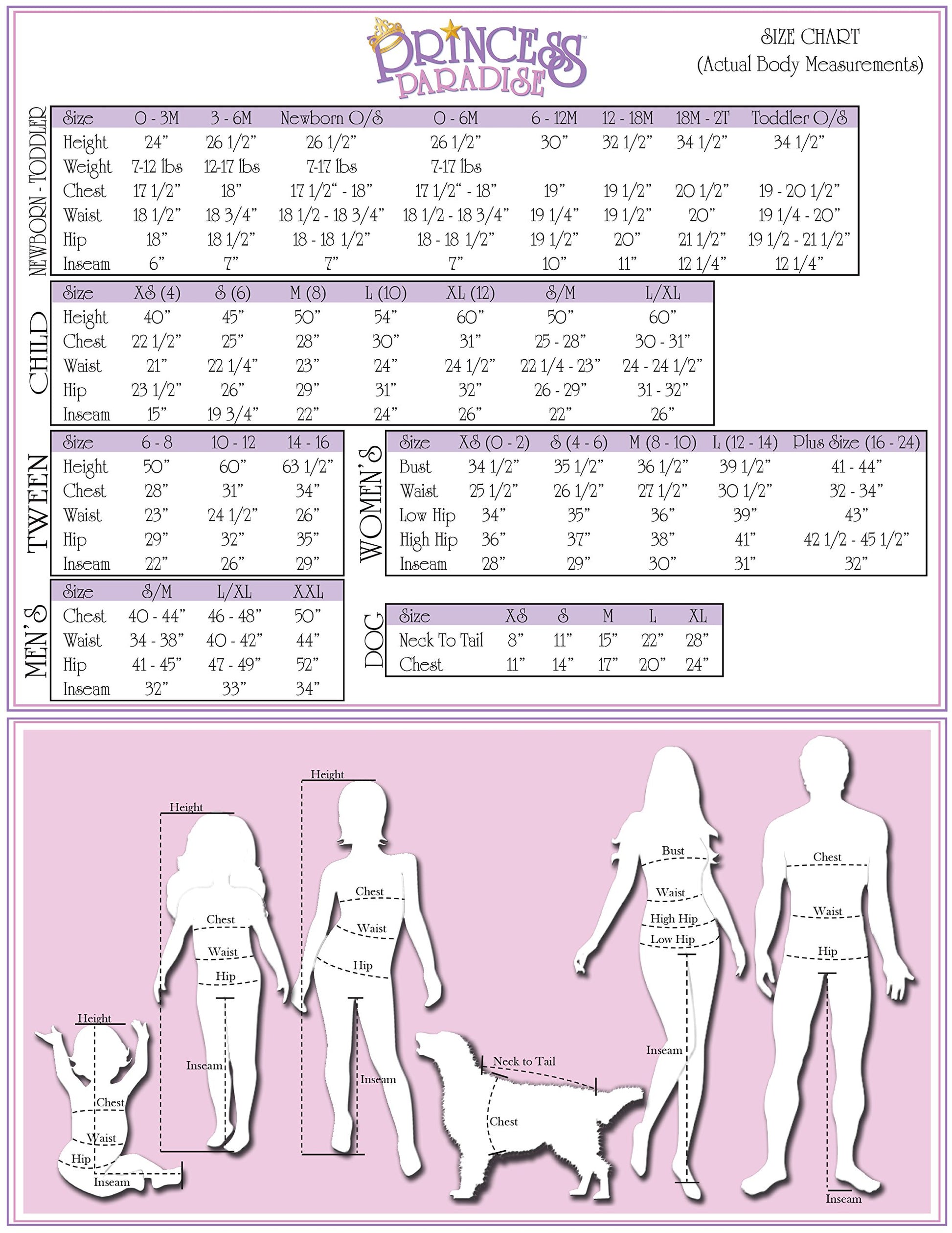 - Q: How should I select the right size for my child? A: Costumes are sized differently than regular clothing. It is recommended to consult the Princess Paradise size chart before making your selection.
