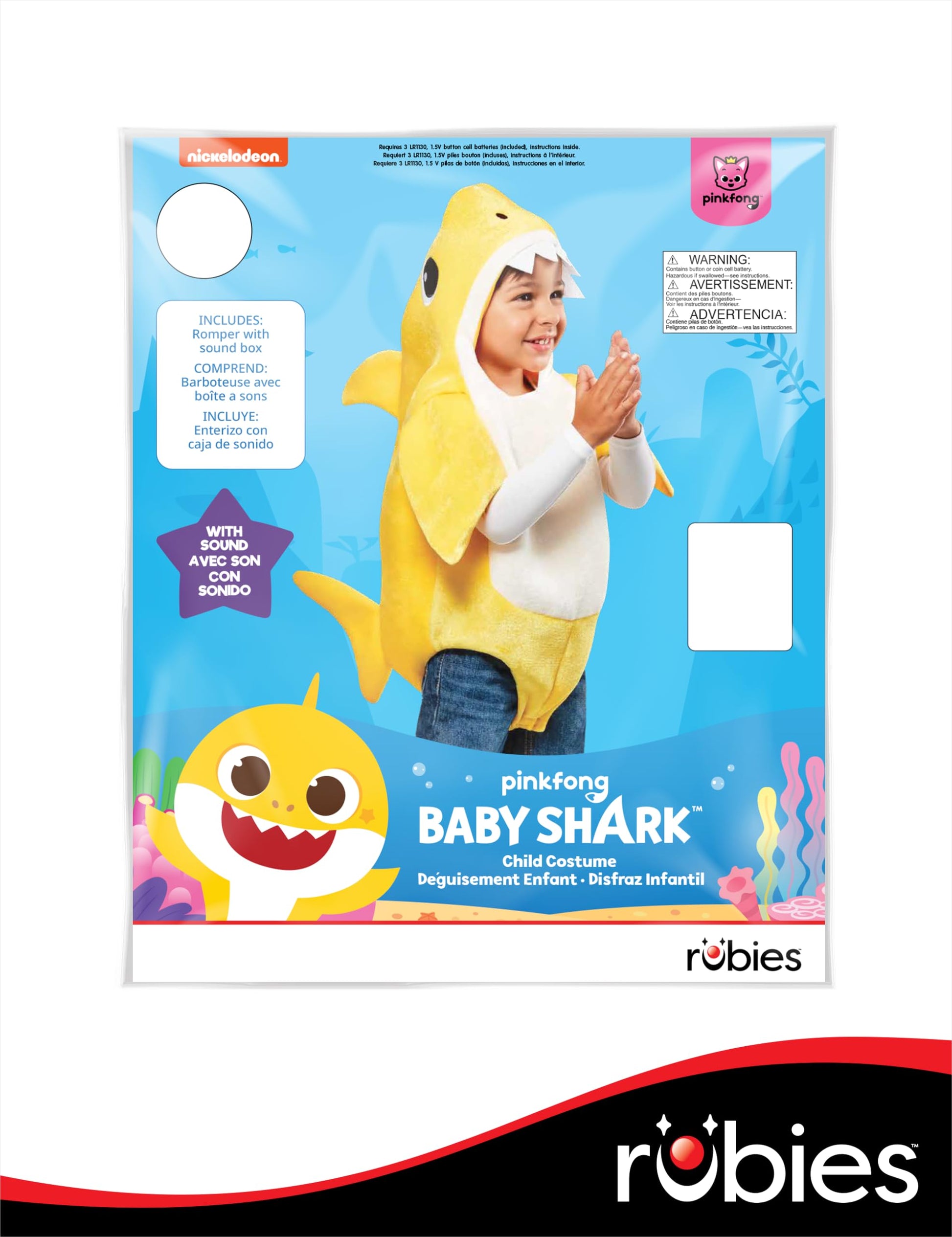 - Q: What sizes are available for the Baby Shark costume? A: The Baby Shark costume is available in various sizes for infants, toddlers, children, and adults. Be sure to consult the Rubies size chart included in the images for accurate sizing.