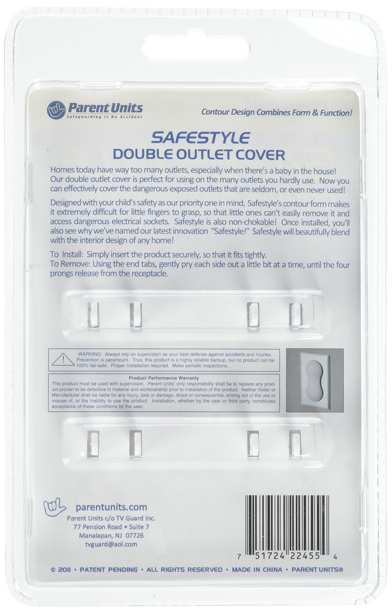 SAFESTYLE DOUBLE OUTLET COVERSafeStyle effectively covers the dangerous exposed outlets that are seldom used. SafeStyles contour form makes it extremely difficult for little fingers to grasp and access dangerous electrical sockets. Additionally, children cant choke on SafeStyle! SafeStyle will blend beautifully with the interior design of any home! 2-pack.Item# 22455