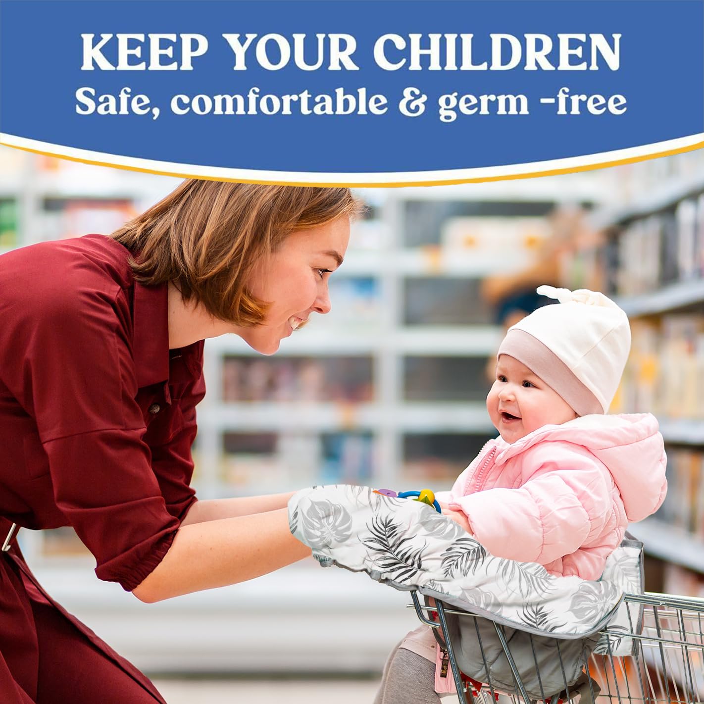 - Q: Does this cart cover have safety features? A: Yes, the Pillani Shopping Cart Cover includes anti-slip features to help keep it securely in place while your baby is seated.