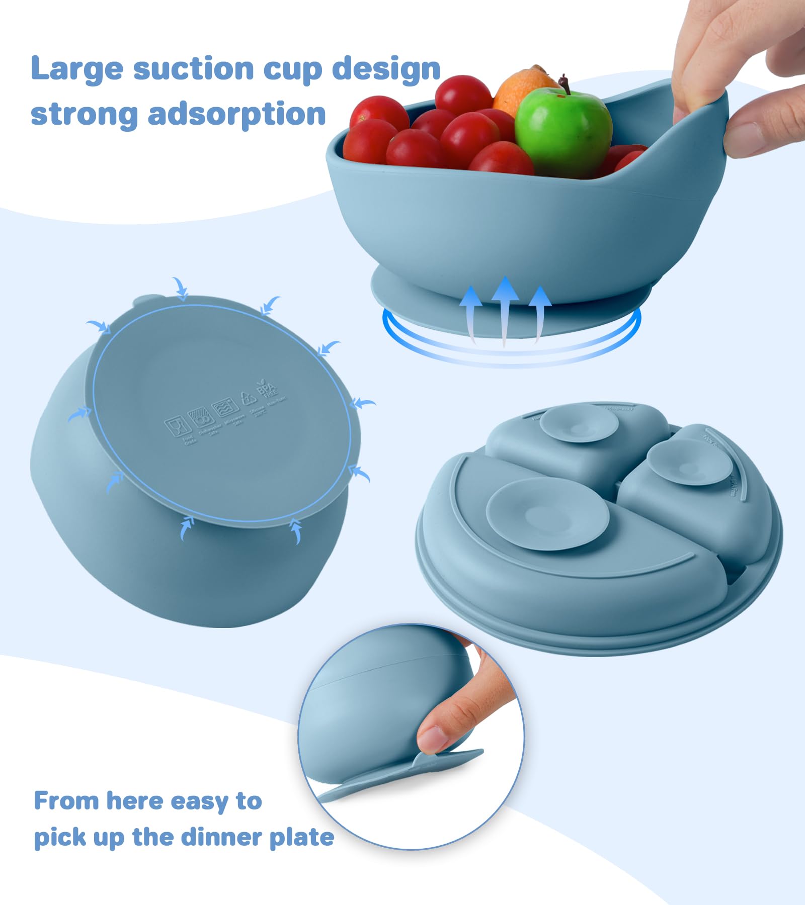- Q: How does the suction feature work? A: The suction base on the plate and bowls sticks firmly to smooth surfaces, helping to prevent spills and keeping the dishes in place during mealtime.