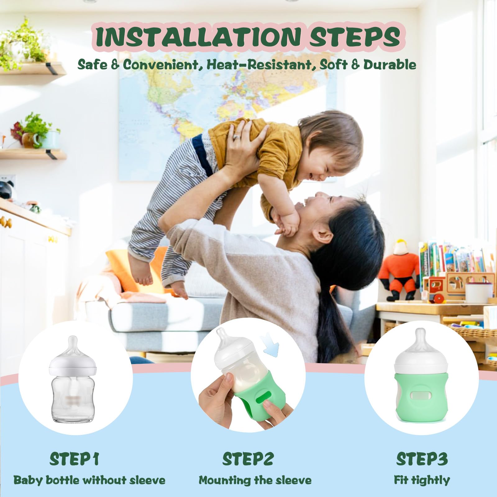 • Q: How easy is it to install the silicone sleeve on the baby bottle? A: The installation is simple; just slide the bottle top through the cutout and secure the silicone sleeve.