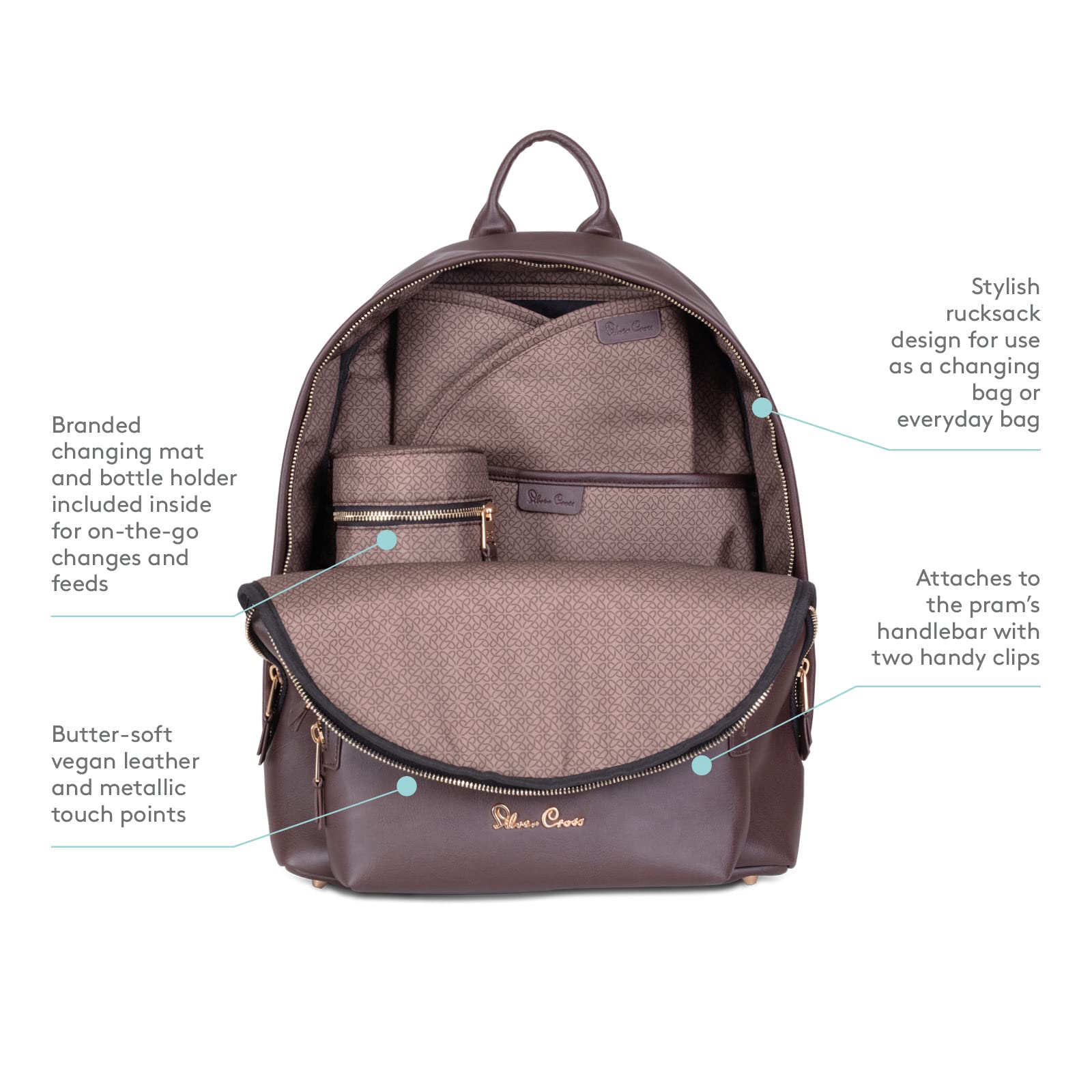 - Q: What colors is the Silver Cross Backpack available in? A: The backpack is available in three colors: black, tan, and cocoa.