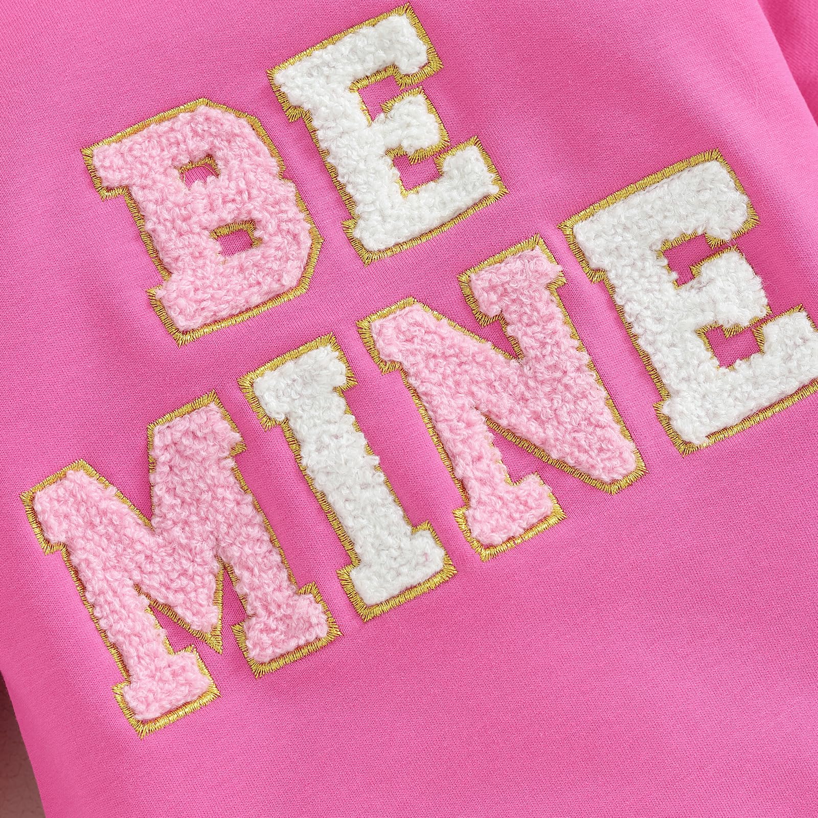 - Q: Does this outfit have any special design features? A: Yes, the outfit features a heart embroidered patch, vintage crewneck design, and playful phrases like 'BE MINE', 'SWEET HEART', and 'HUG ME' on the bubble onesie.